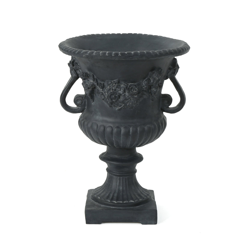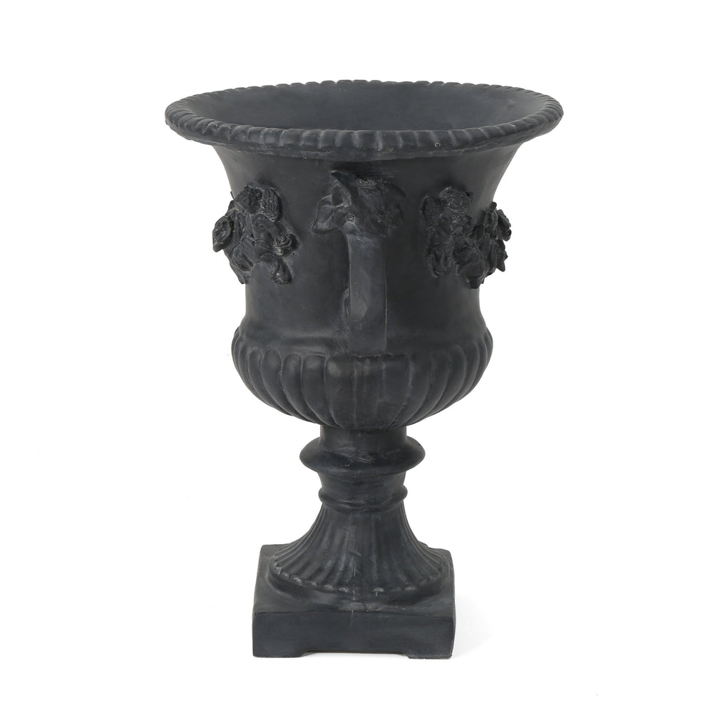 The Buena Vista Urn is a decorative planter designed for enhancing outdoor spaces such as patios and gardens as well as indoor areas. It combines functional plant display with a timeless antique black finish for versatile style.