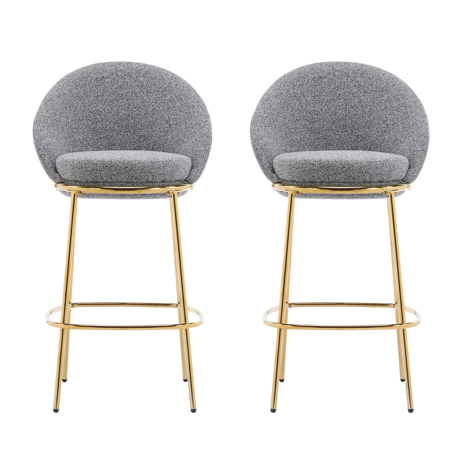 These Celano barstools feature a gold-plated metal frame and mixed gray upholstery, designed to enhance dining rooms, home bars, or kitchen counters with a blend of modern style and comfort.