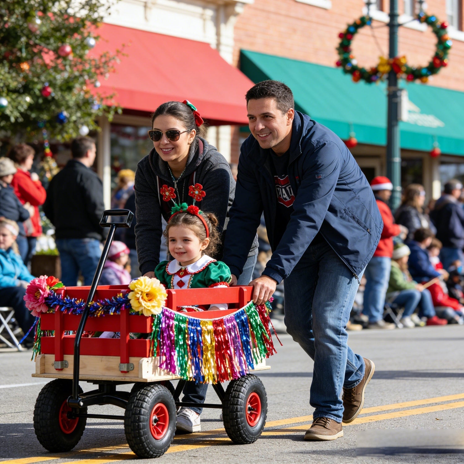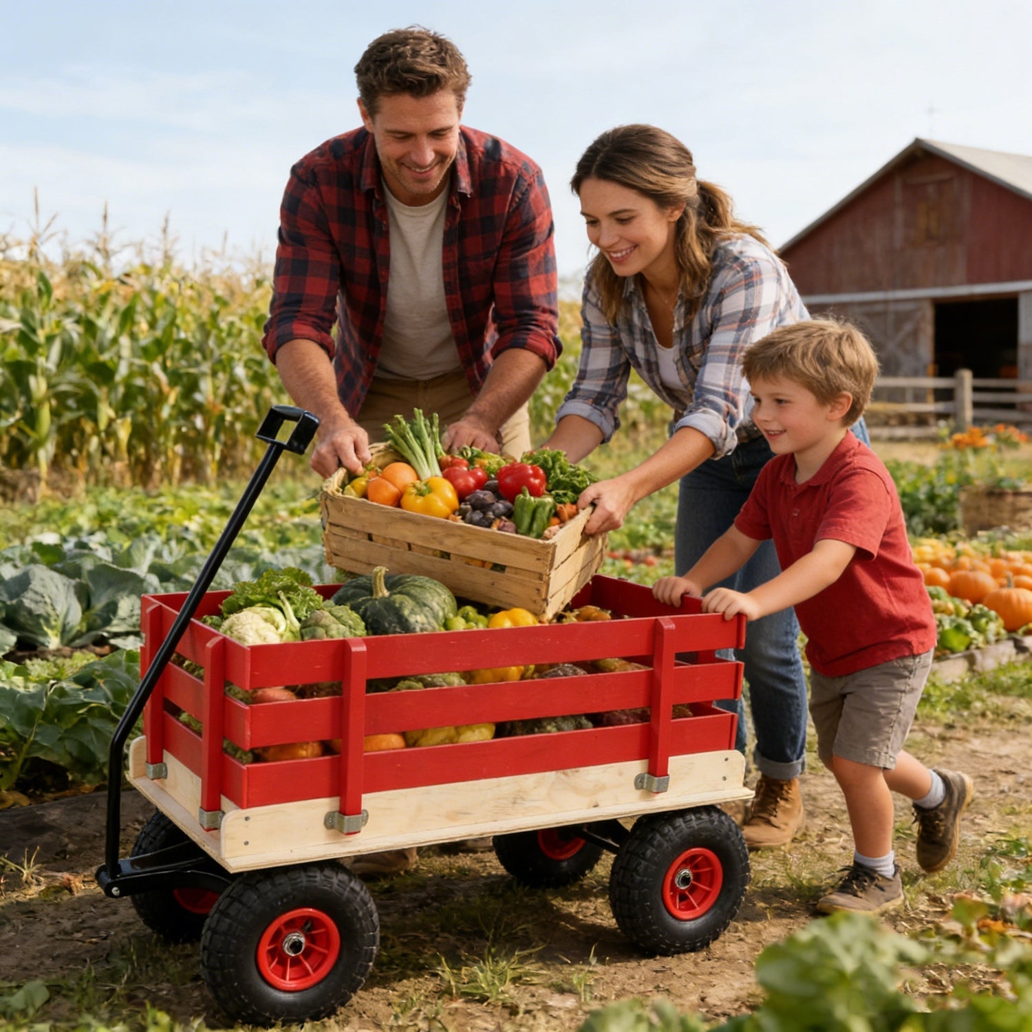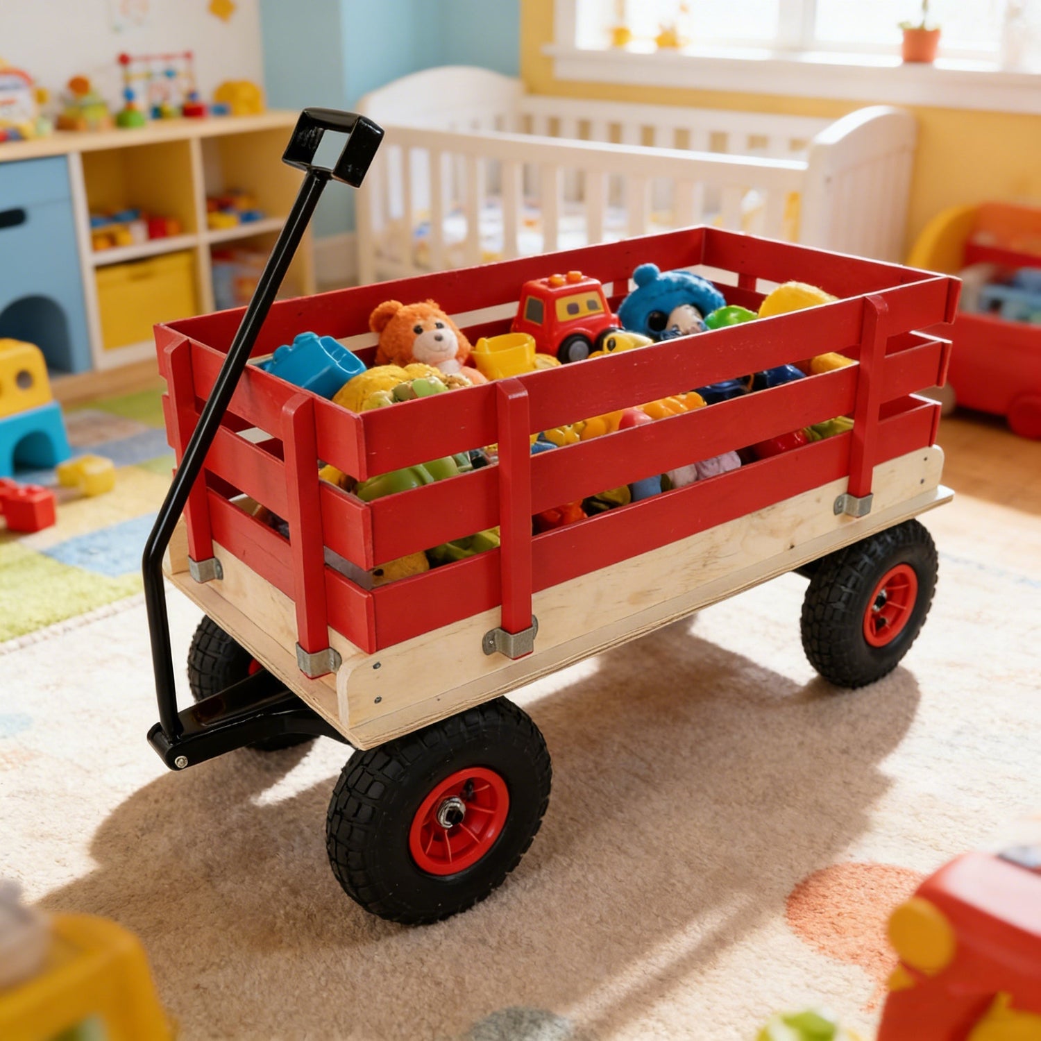 - 3. Large-capacity open cargo boxsuitable for multiple scenarios: The spacious red and natural wood color cargo box can hold toysgardening toolspicnic suppliesetc. The fence design not only prevents items from falling but also makes it convenient to take them out. It serves as both a 'toy transport vehicle' for children and a practical tool for family outdoor activities and gardening.