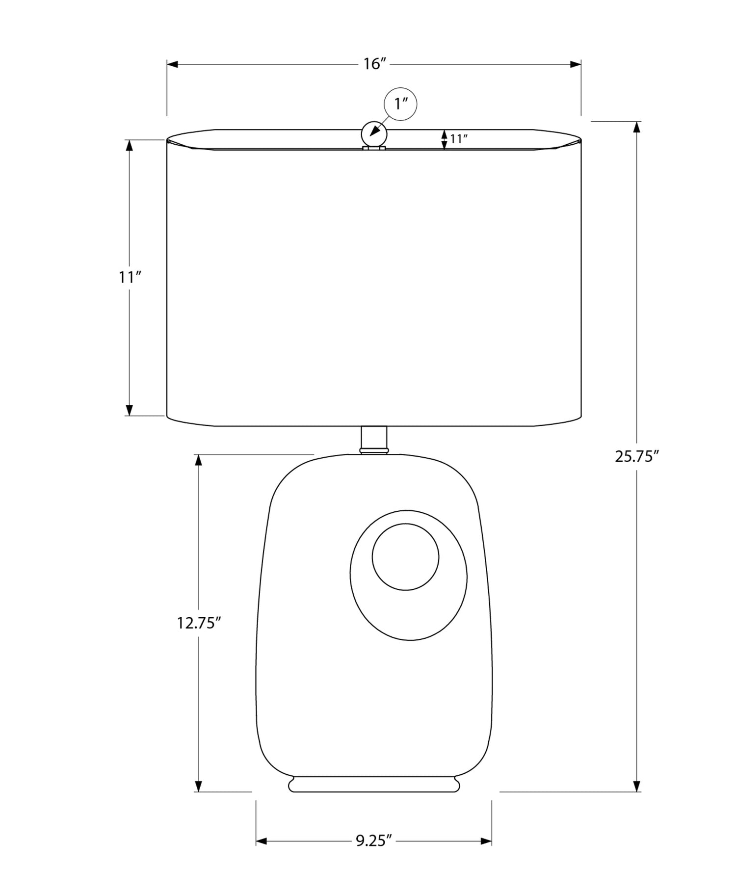 16 in. W x 11 in. D x 25.75 in. H; base: 9.25 in. W x 5.75 in. D x 12.75 in. H; shade: 16 in. W x 11 in. D x 11 in. H; cord length: 6 ft