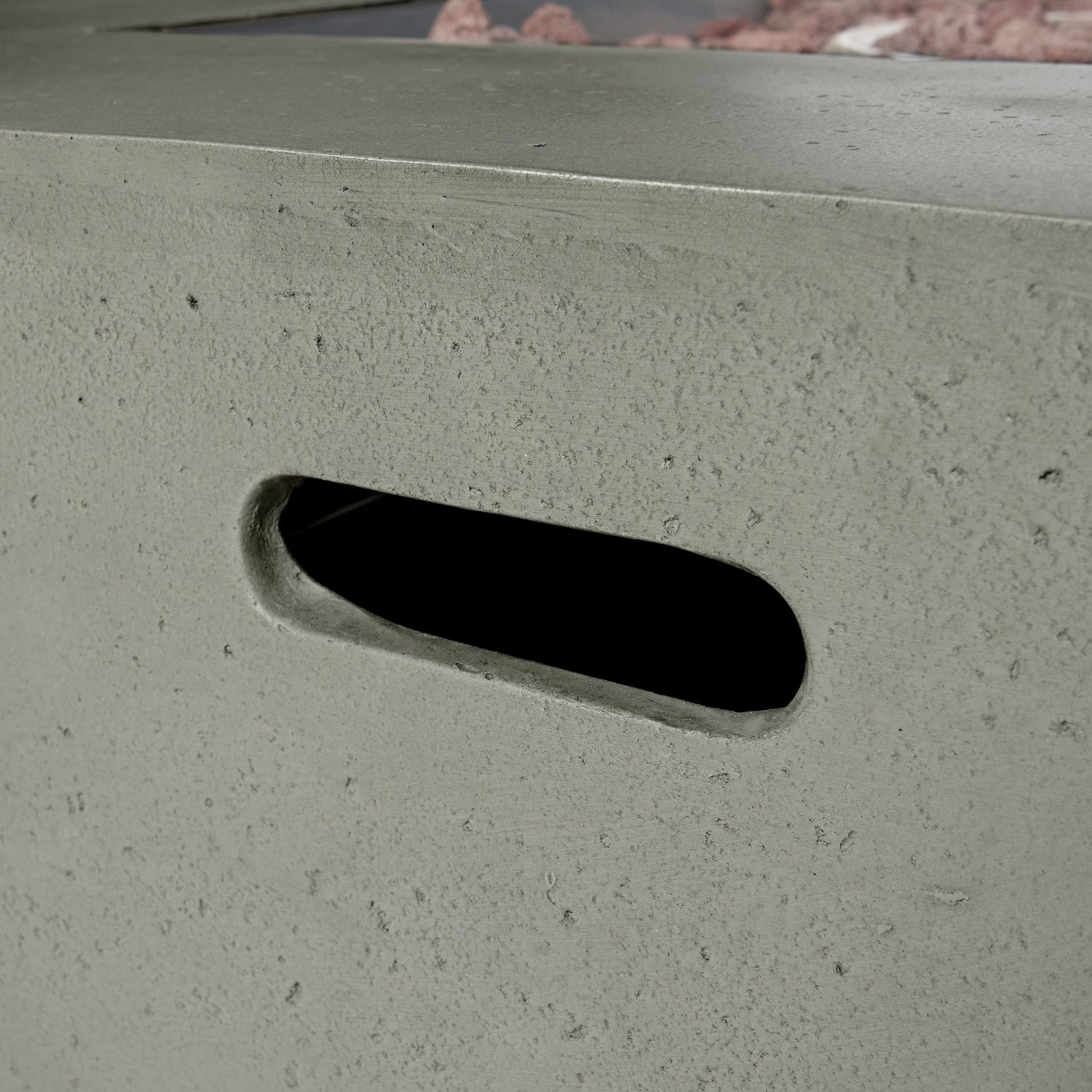 This contemporary square fire table provides warmth and style to outdoor spaces. Featuring a smooth magnesium oxide surface in light grey, it complements patios and backyard seating areas with a modern aesthetic.