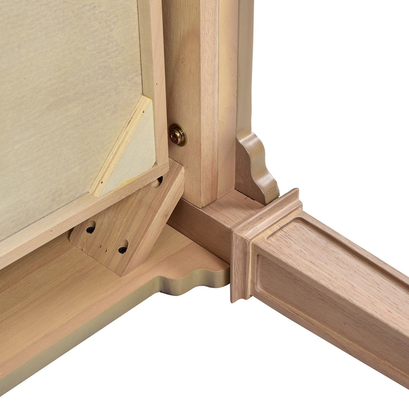 - Satin-gold drawer pulls complement the natural wood finish of the desk
