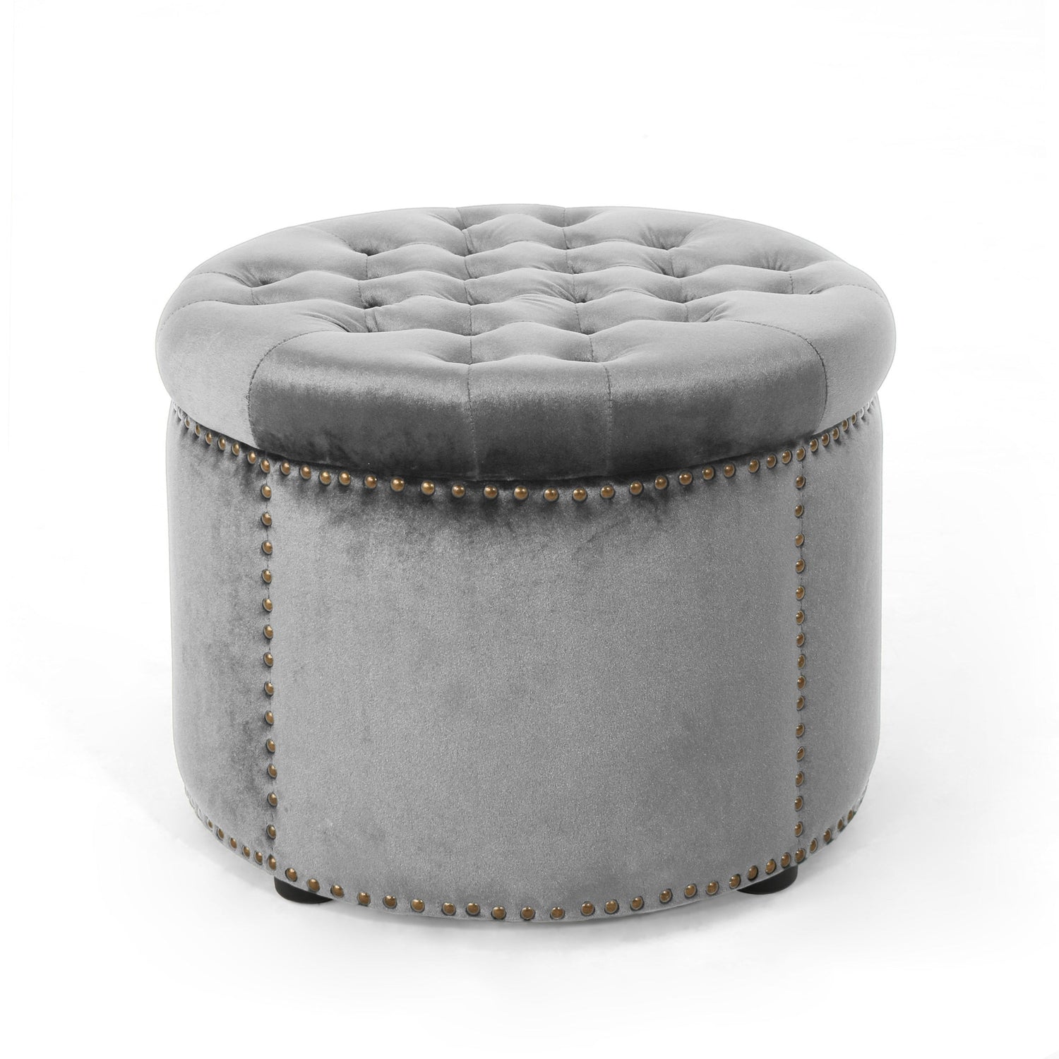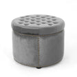 Elegant Round Ottoman Footstool with Grey Velvet Upholstery and Studded Rim