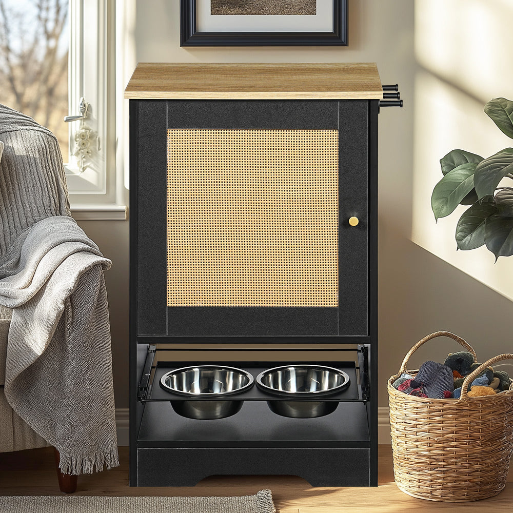 This feeding station is designed for pets, ideal for use in any feeding area to organize meals and accessories with style and convenience.
