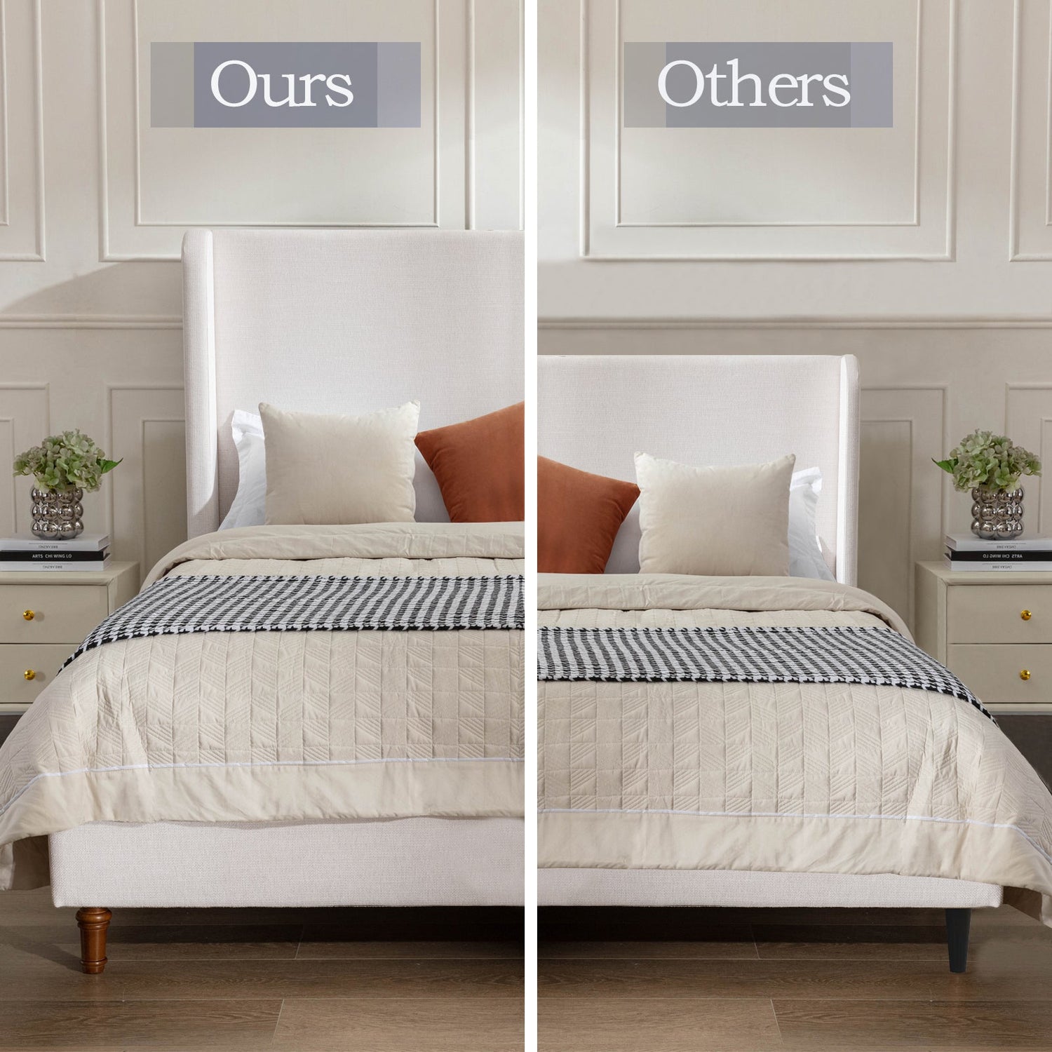 The Hayden King Size Upholstered Wingback Bed is a refined choice for any bedroom, blending comfort and elegance with its tall 54-inch headboard and textured ivory chenille upholstery.