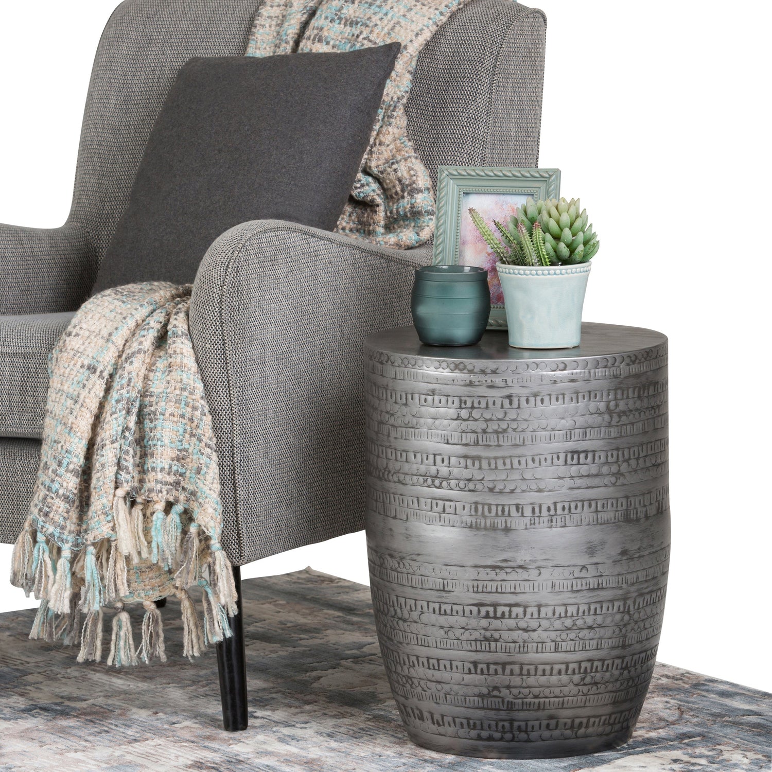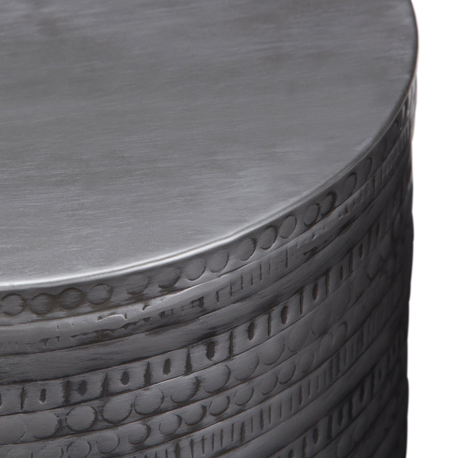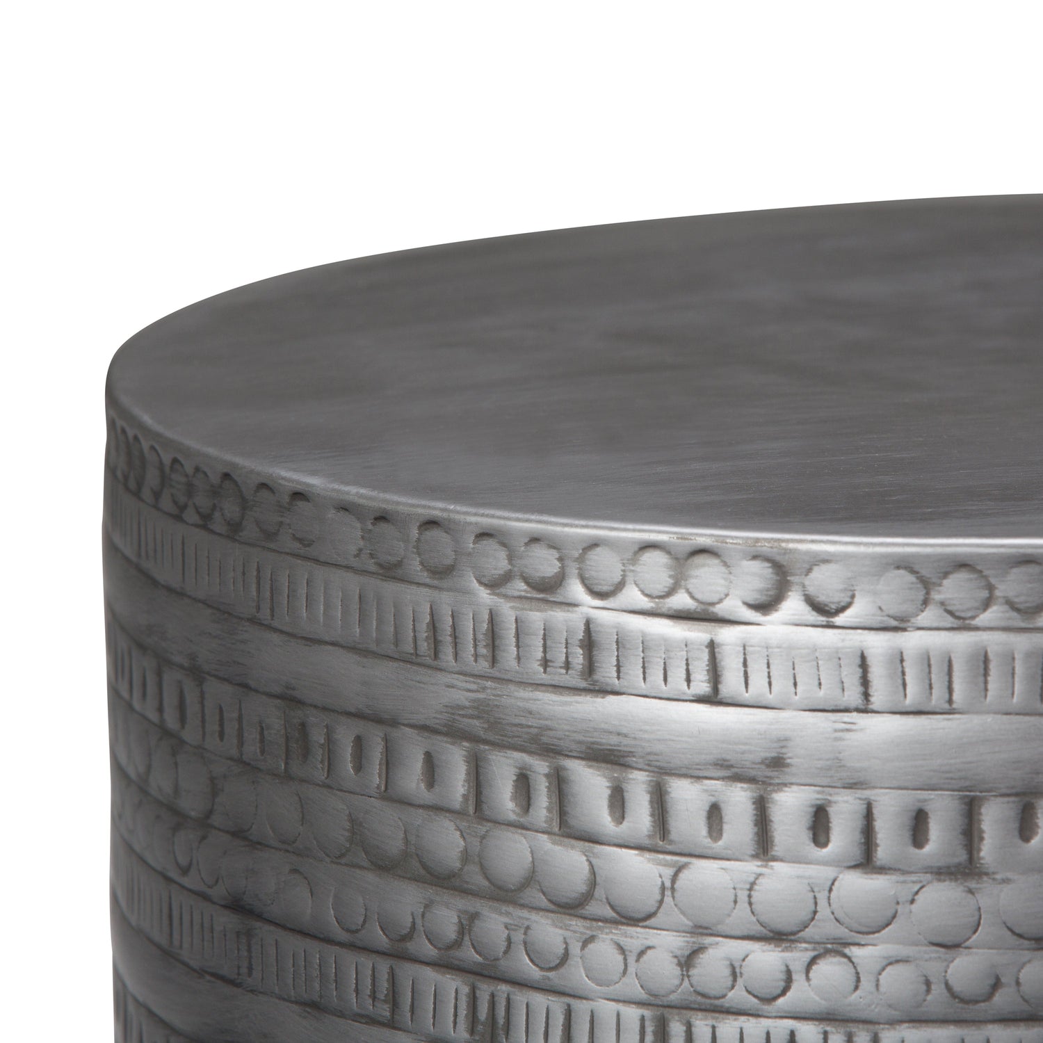 This handcrafted metal accent table features a tribal pattern and an antique silver finish, making it suitable for living rooms, bedrooms, or office spaces. It combines style and function as an elegant accent piece.