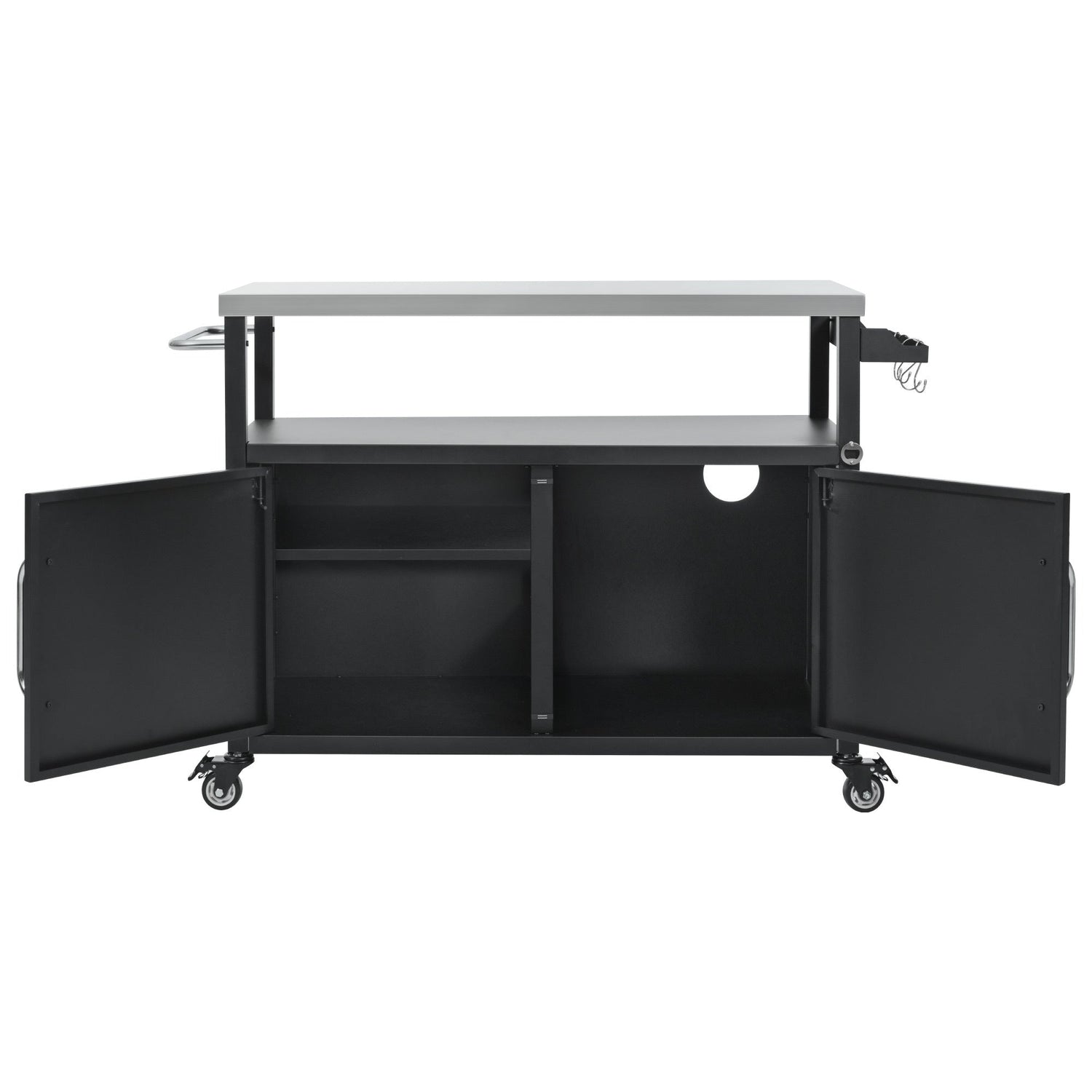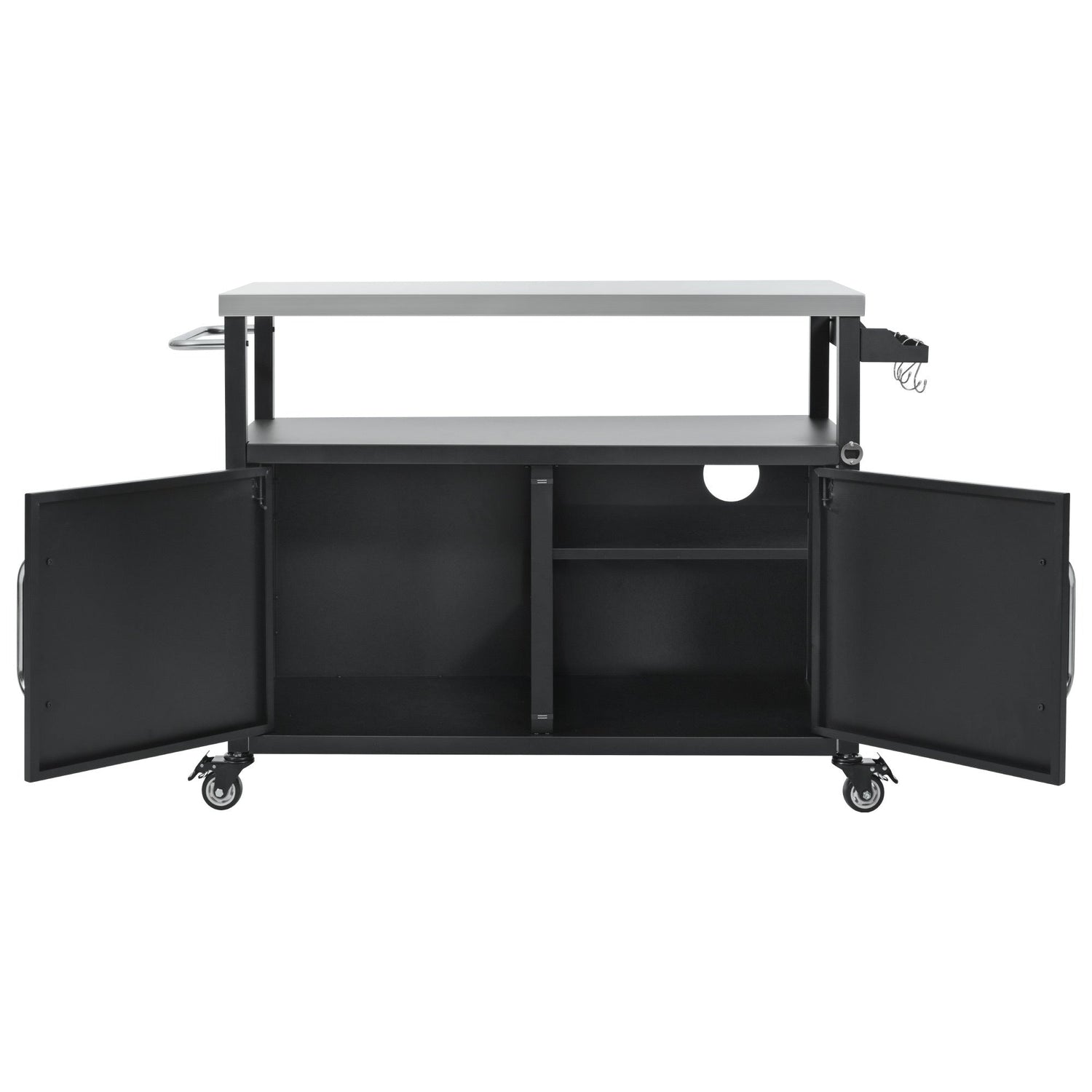 - Includes storage cabinet, spice rack, and towel rack to improve BBQ and food preparation convenience