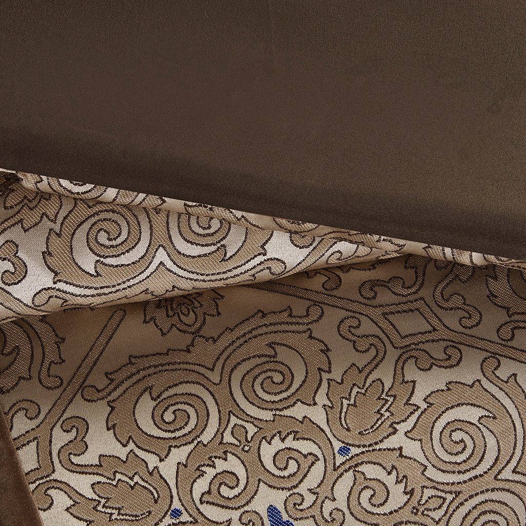 This king-sized 7-piece comforter set enhances your bedroom with its elegant navy jacquard design. It combines classic style with functional bedding essentials for a polished and comfortable sleep space.