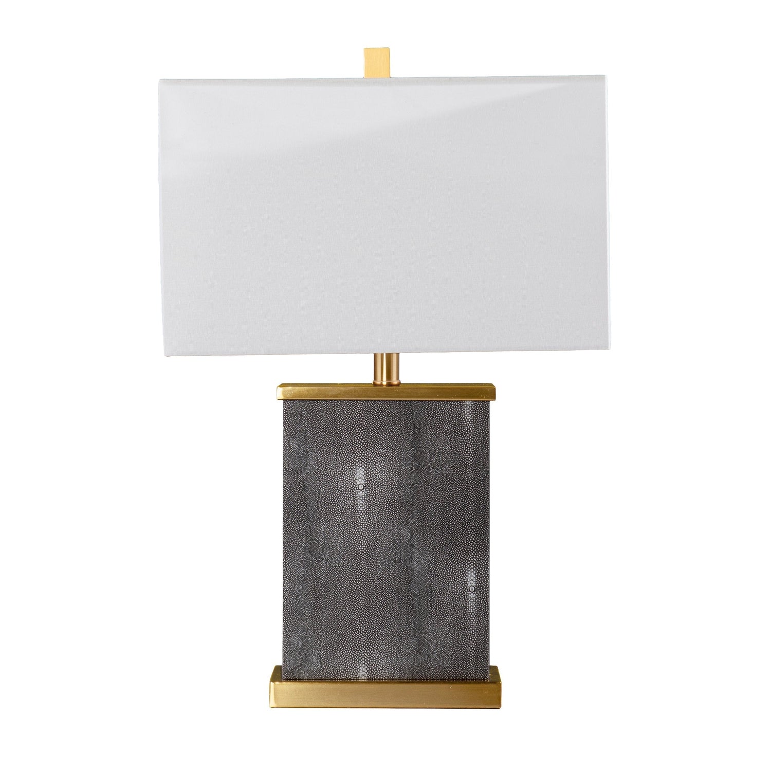 - Materials: Iron frame wrapped in black faux shagreen with a white linen shade