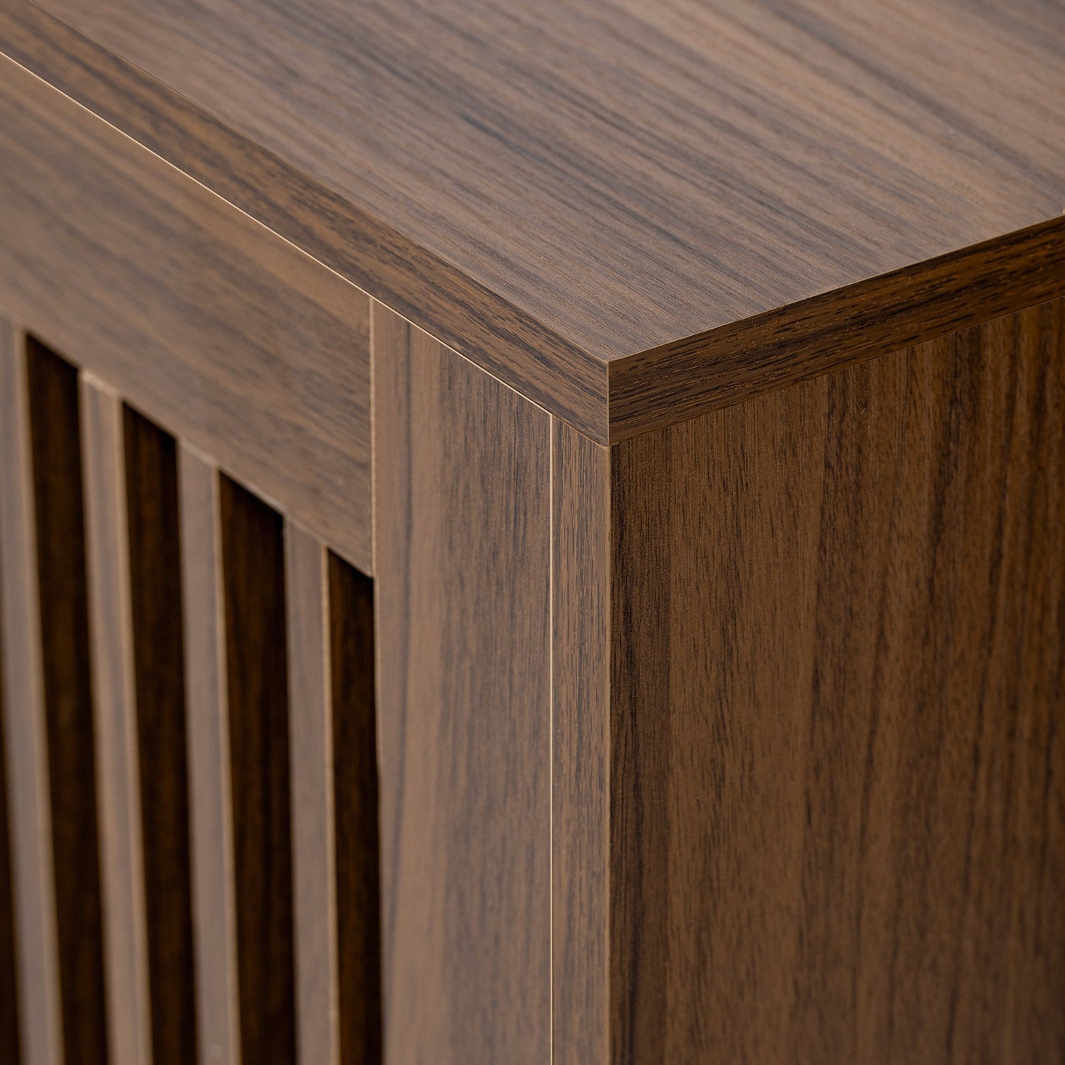 Furniture Style Mid-Century Modern Walnut Entertainment Stand for cat lover. Removable sliding door with shutters is perfect for a mid-century vibe.
