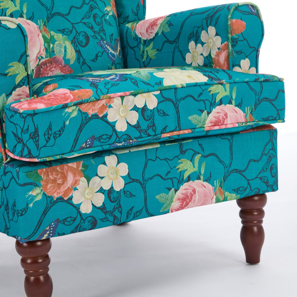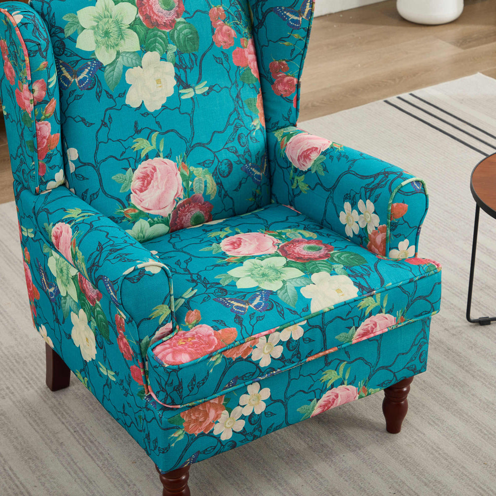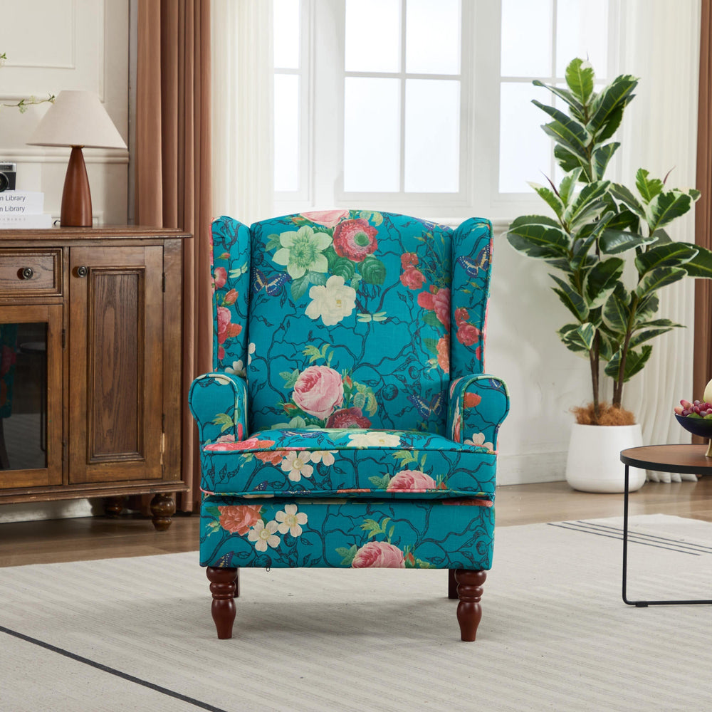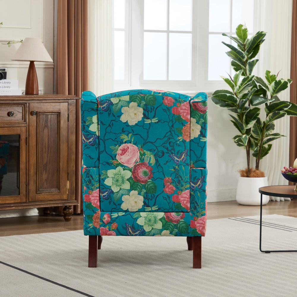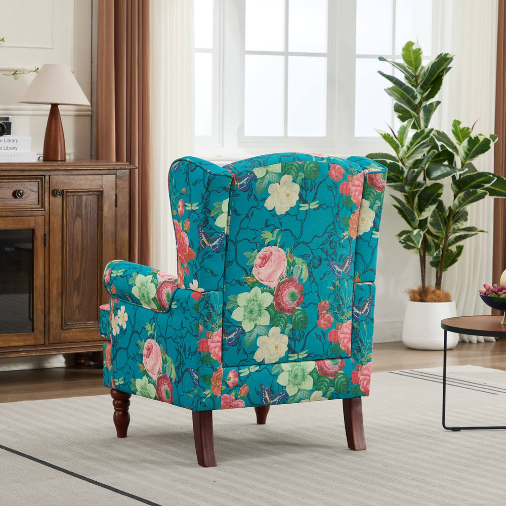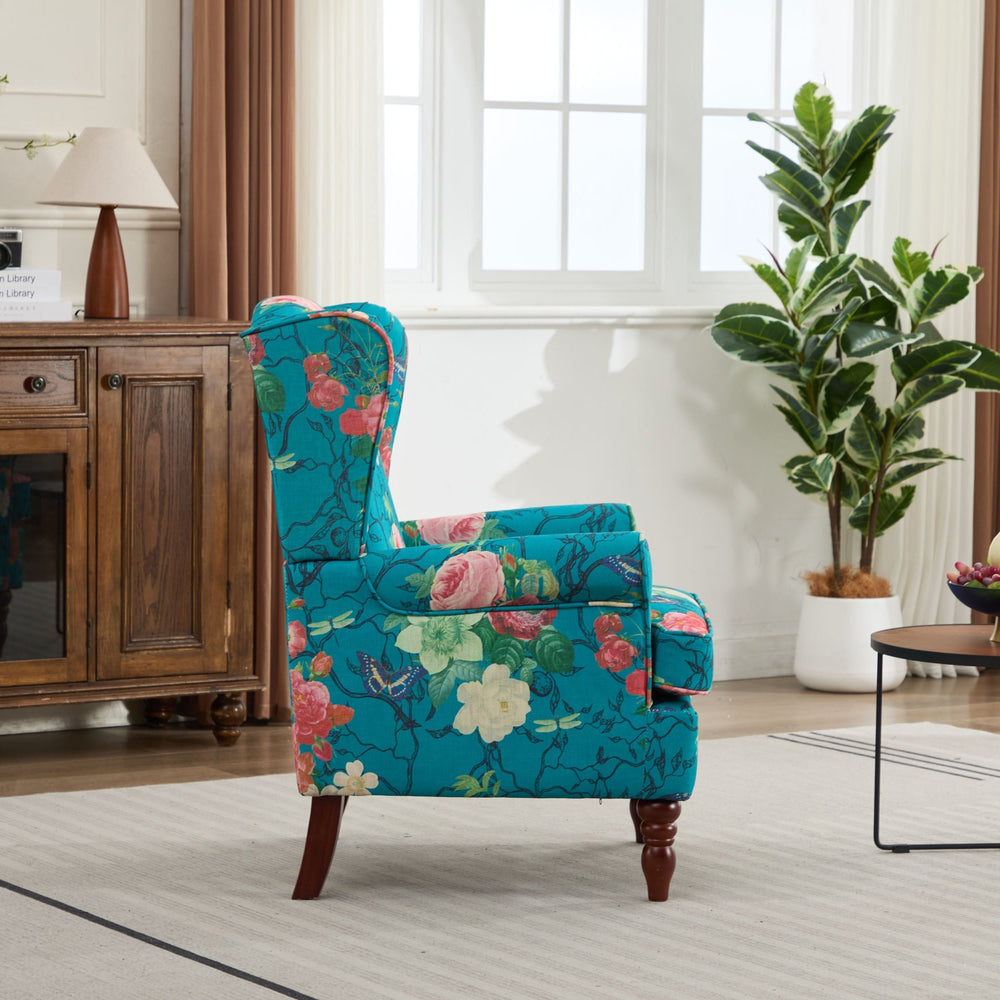 This modern accent chair combines comfort and style, featuring a floral patterned fabric and retro-inspired solid wood legs. It complements living rooms, bedrooms, or office spaces as a functional and decorative seating option.