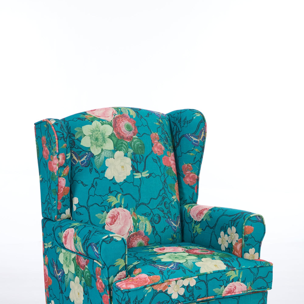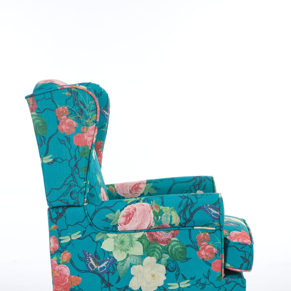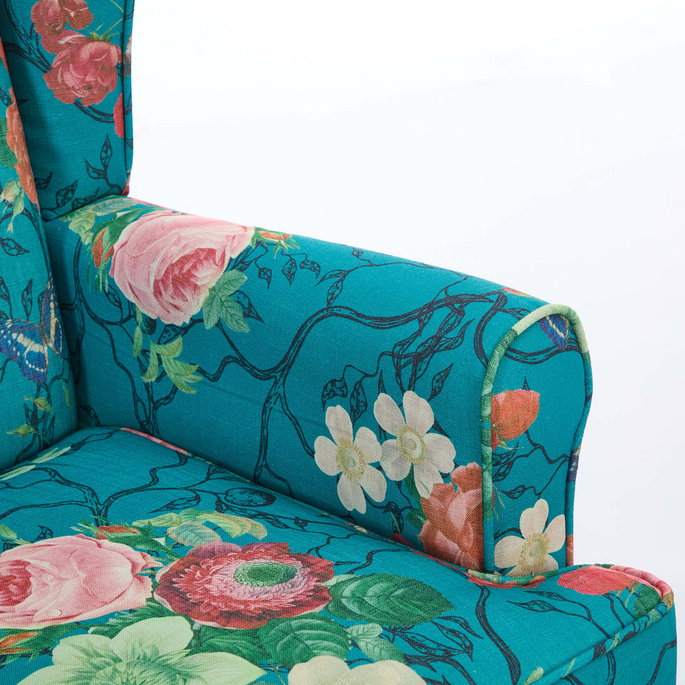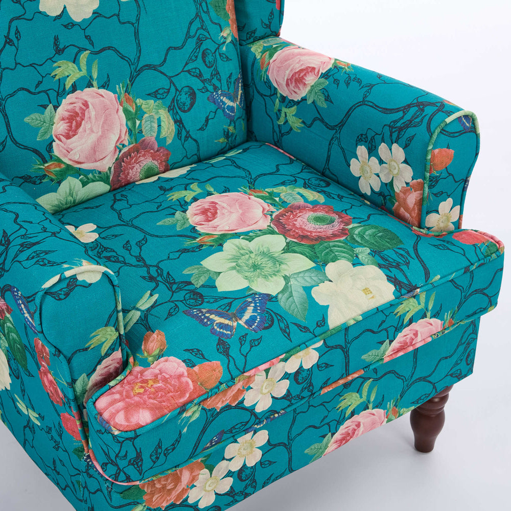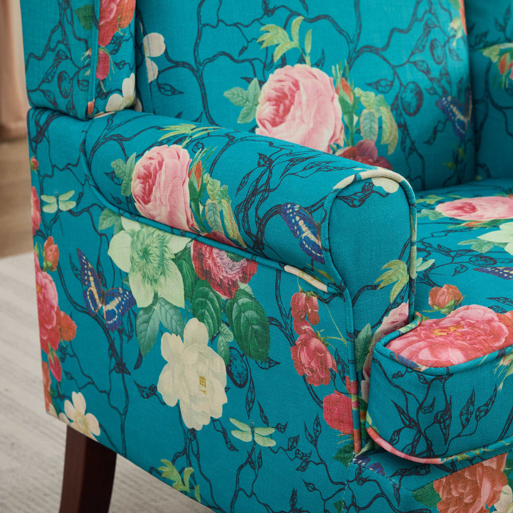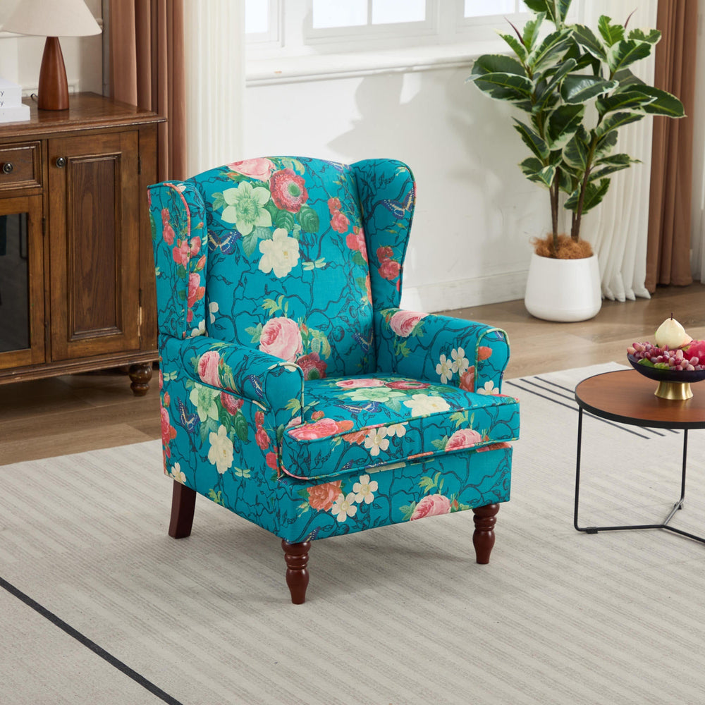 This modern accent chair combines comfort and style, featuring a floral patterned fabric and retro-inspired solid wood legs. It complements living rooms, bedrooms, or office spaces as a functional and decorative seating option.