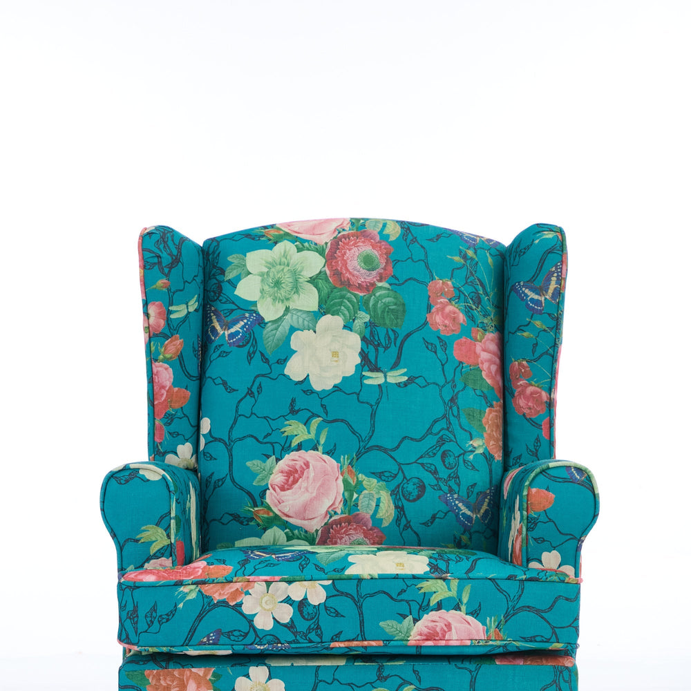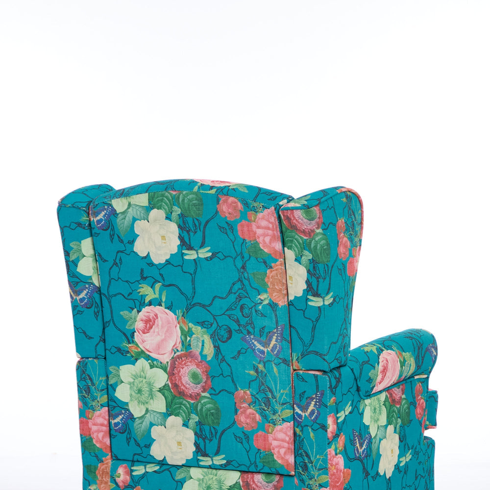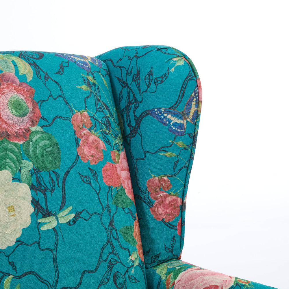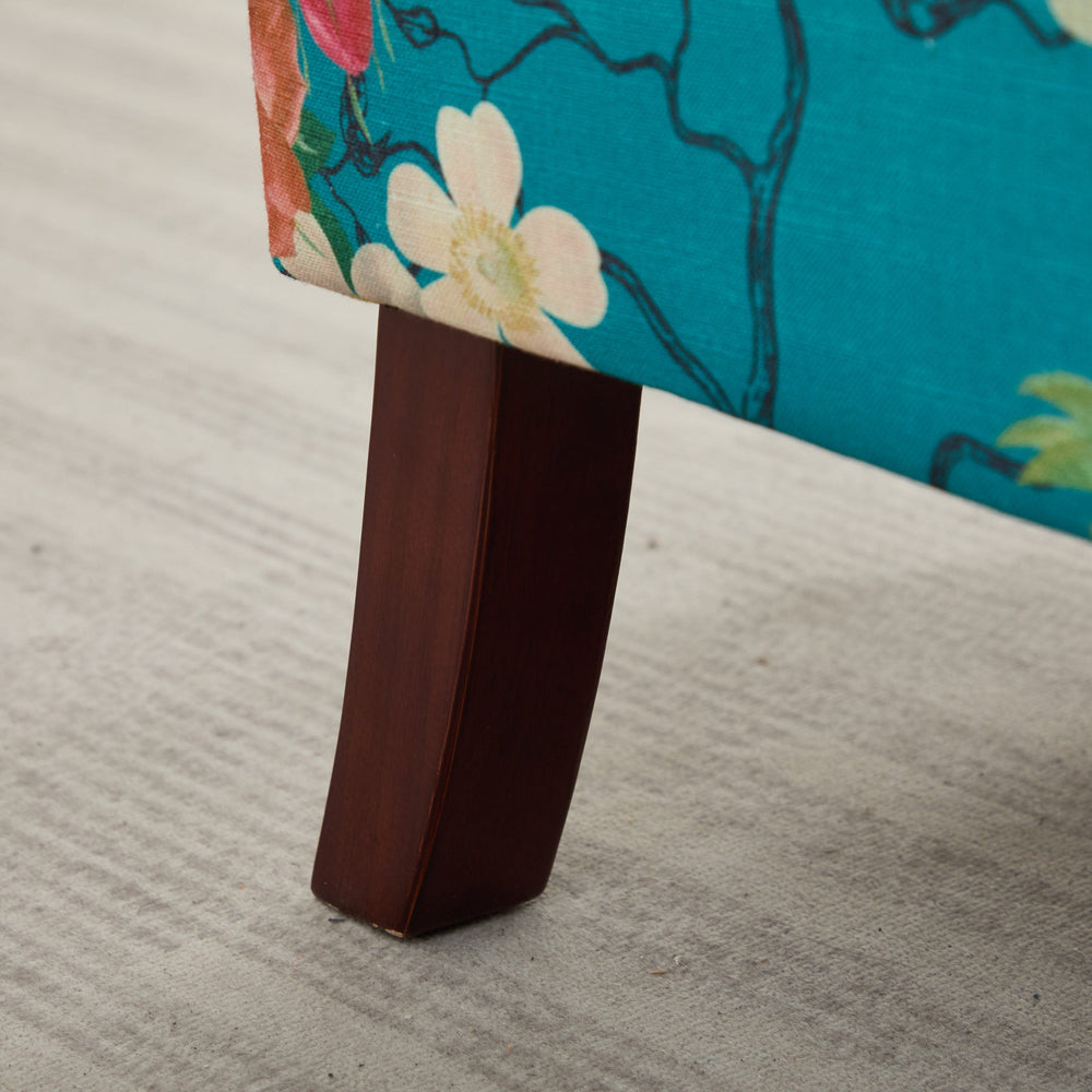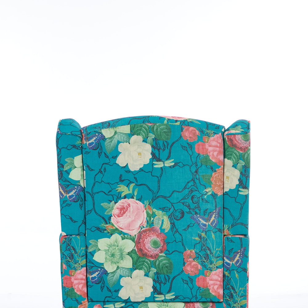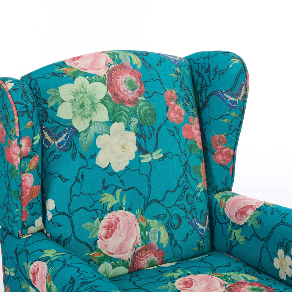 This modern accent chair combines comfort and style, featuring a floral patterned fabric and retro-inspired solid wood legs. It complements living rooms, bedrooms, or office spaces as a functional and decorative seating option.