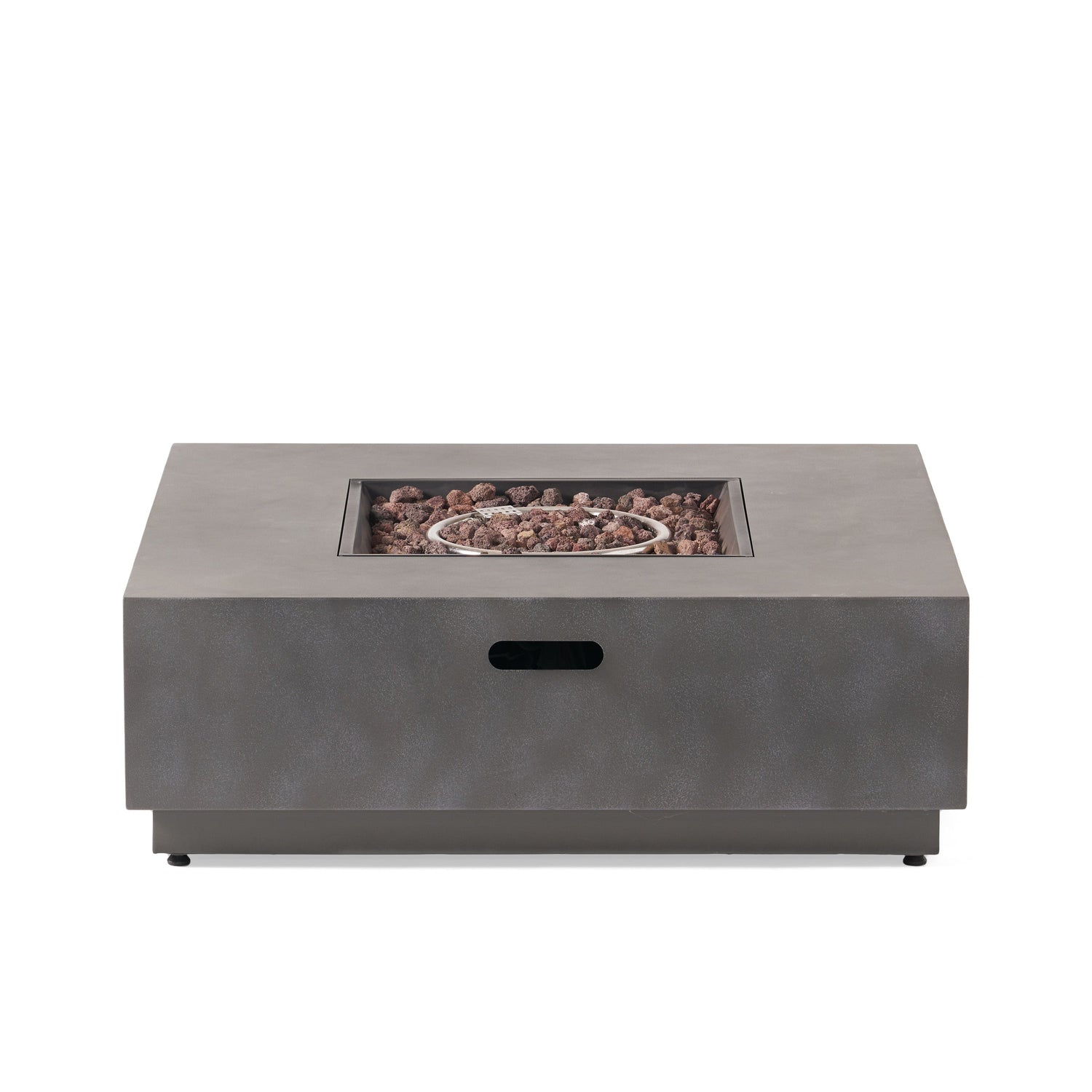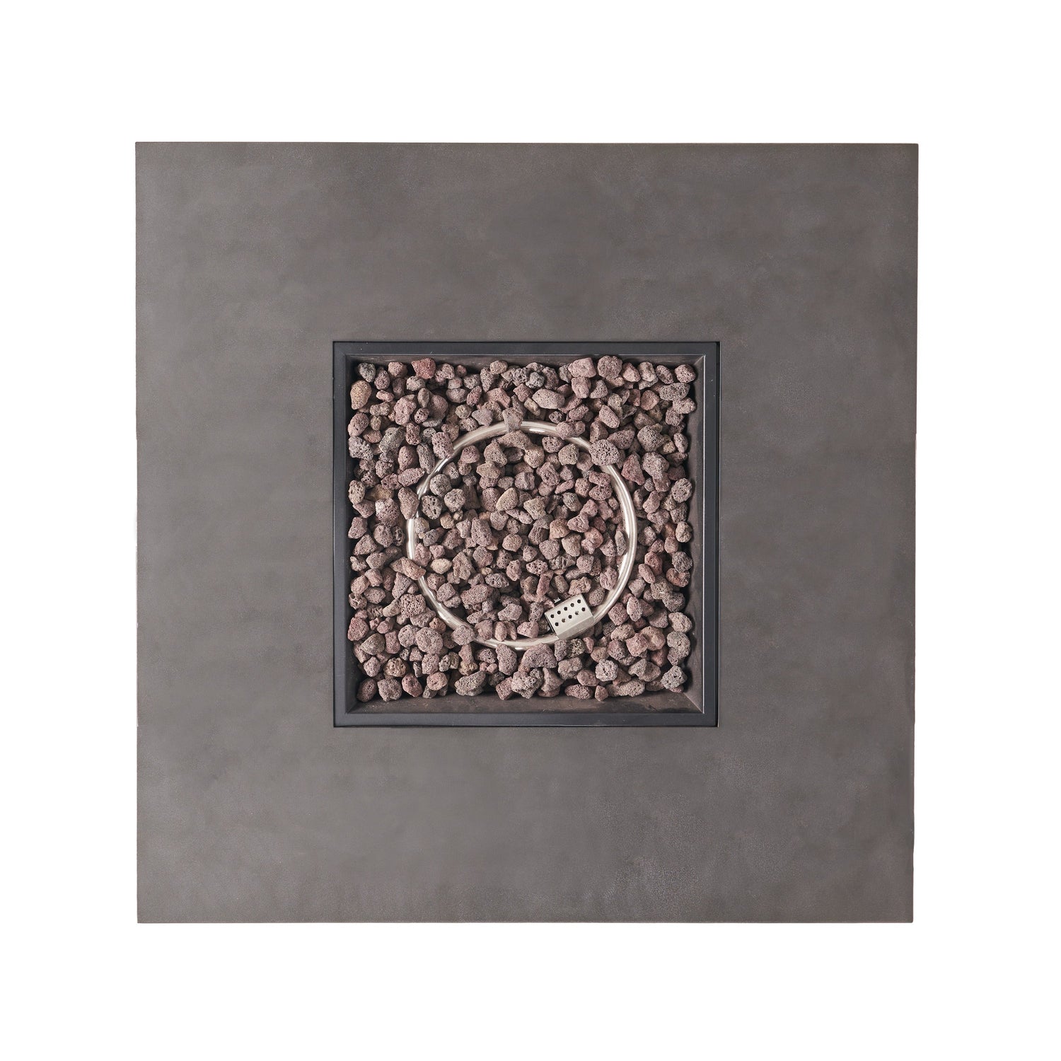 This modern square fire pit is designed for outdoor spaces, providing both warmth and style. Its clean lines and stone gray finish complement contemporary patios and seating areas.