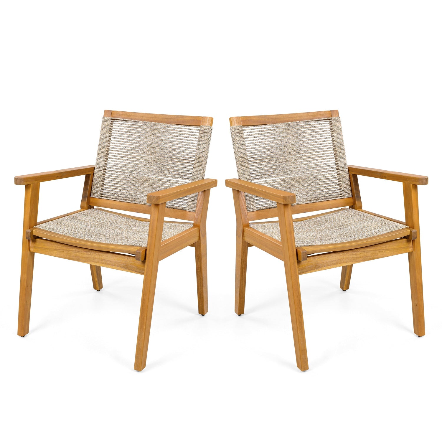 This set of two outdoor dining chairs features a teak-finished acacia wood frame paired with brown rope weaving, ideal for enhancing your patio or courtyard with durable and stylish seating.
