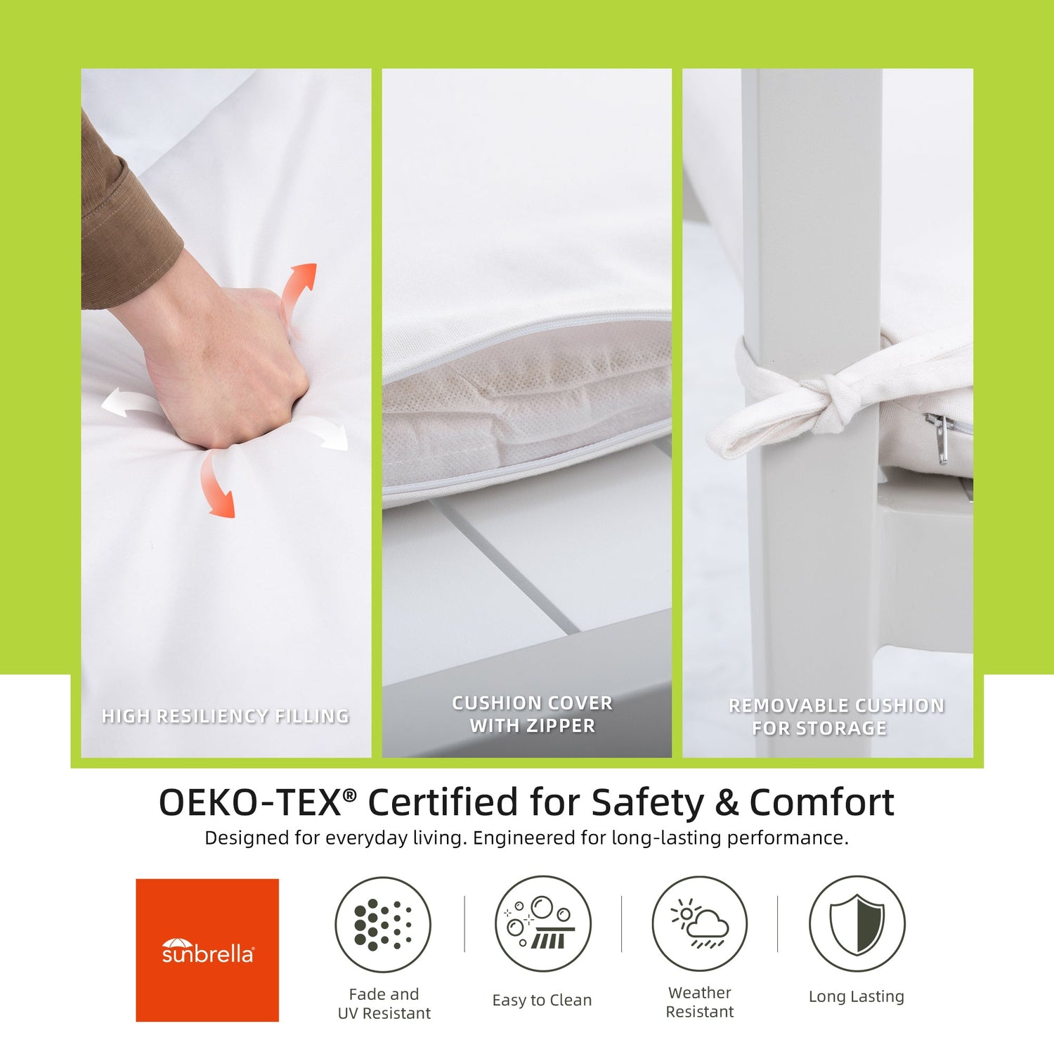 • Durable Sunbrella Fabric Cushion: A renowned American outdoor furniture fabric brand offers durability with the softest, strongest fibers for lasting comfort. Weather-resistant, they withstand sun, rain, snow, and humidity. Easy to clean and stain-resistant, spills are managed with mild soap or diluted bleach. Solution-dyed with UV-stabilized pigments, Sunbrella fabrics stay vibrant and fade-proof over time.