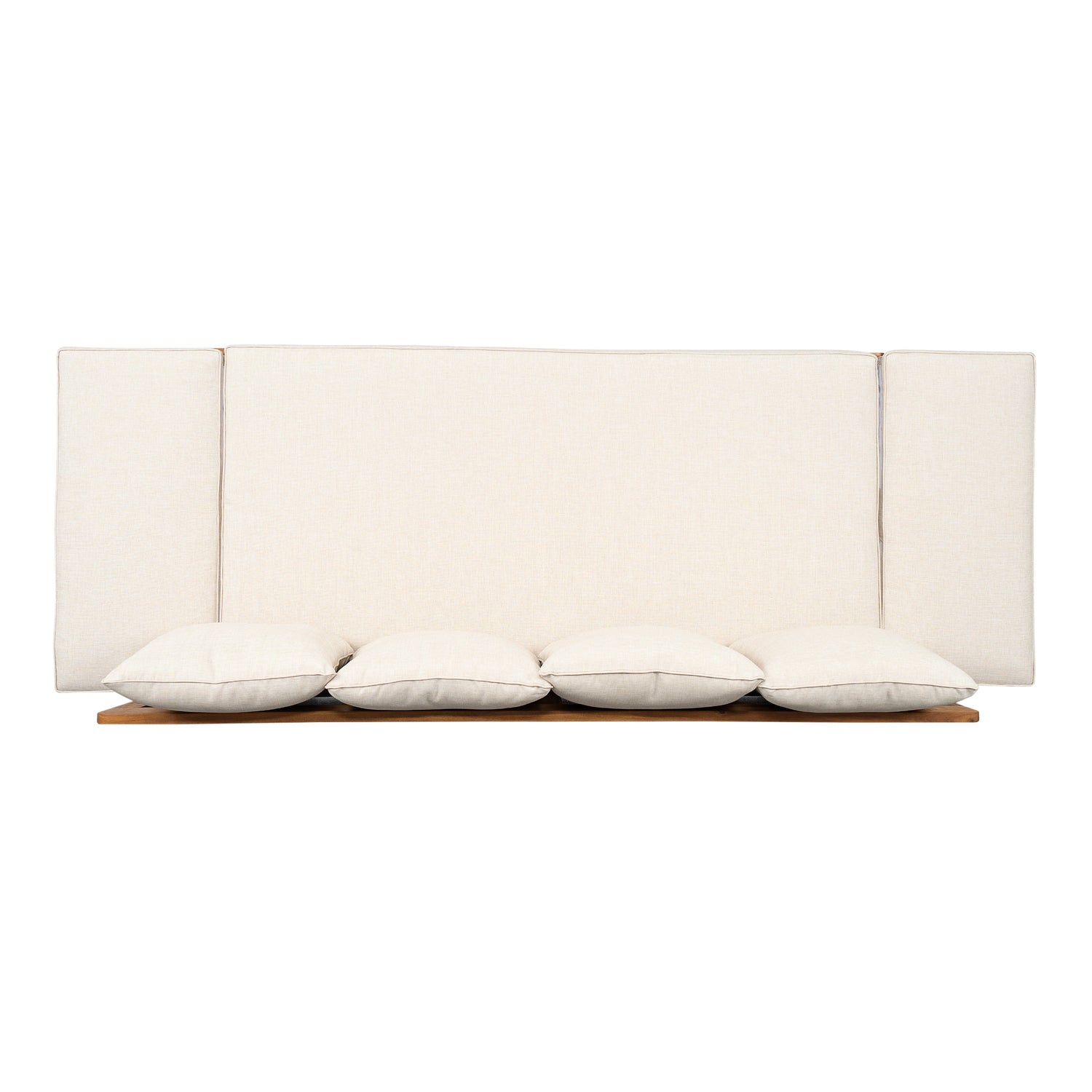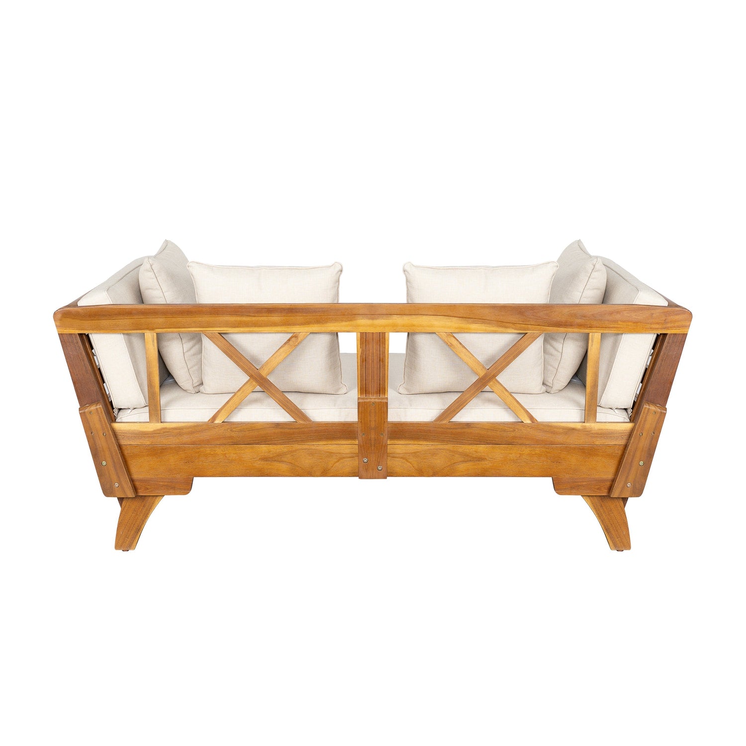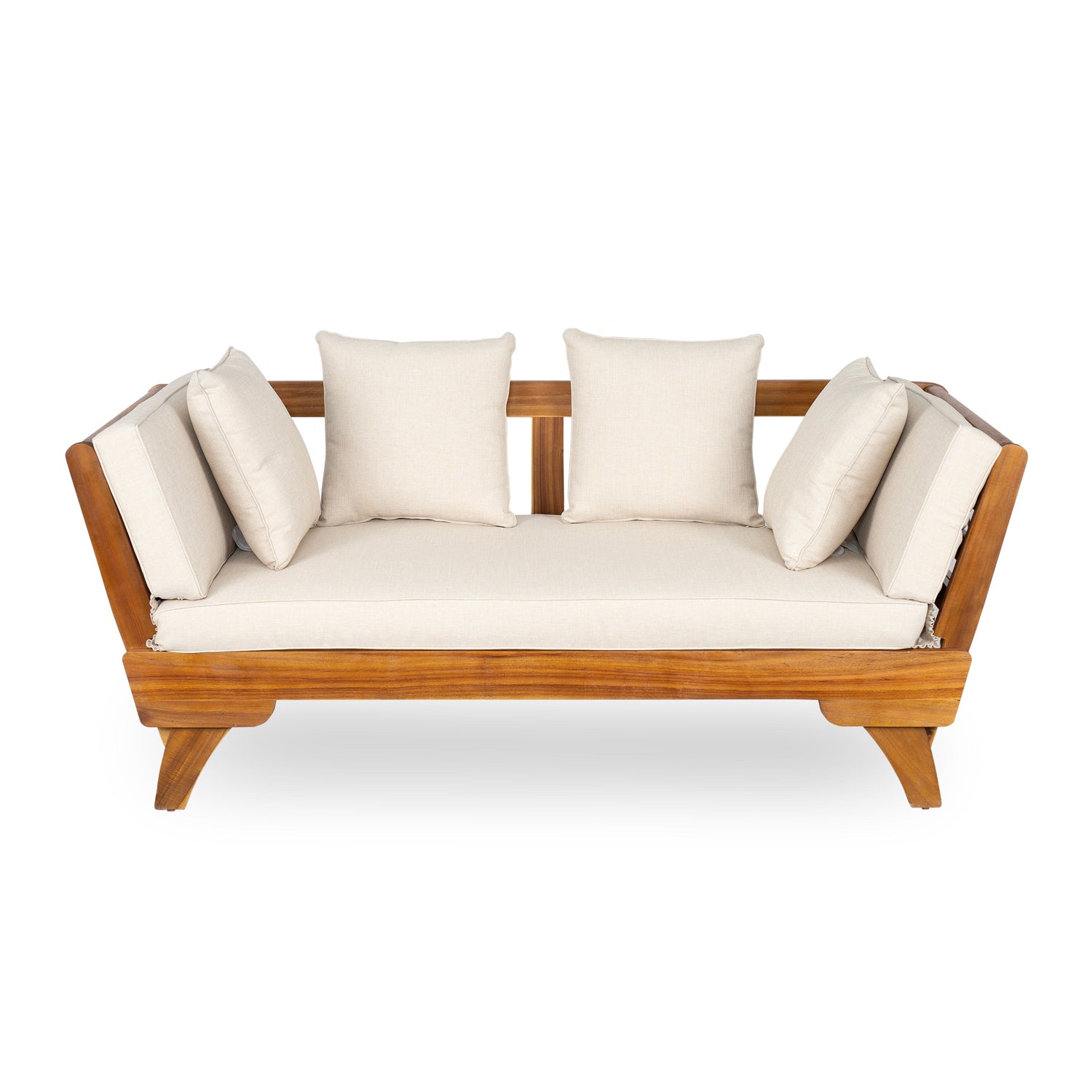 This outdoor patio daybed sofa features a versatile 3-seat design ideal for patios and balconies. Crafted for alfresco living, it combines stylish teak acacia wood with comfortable, weather-resistant cushions.