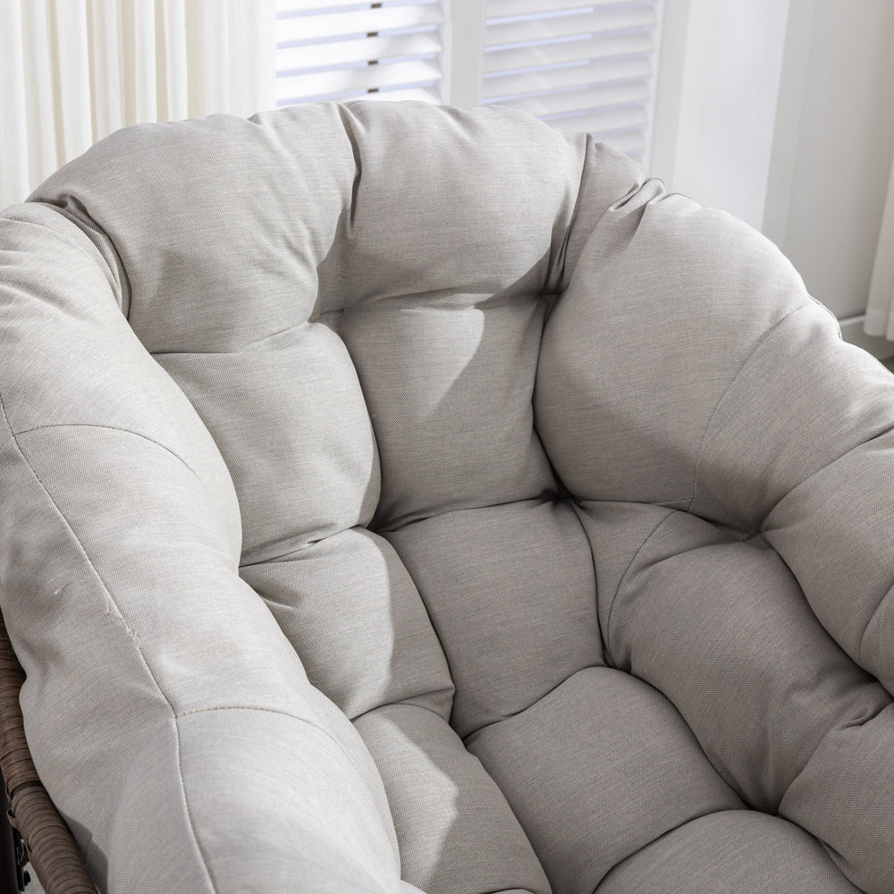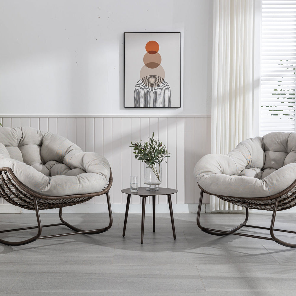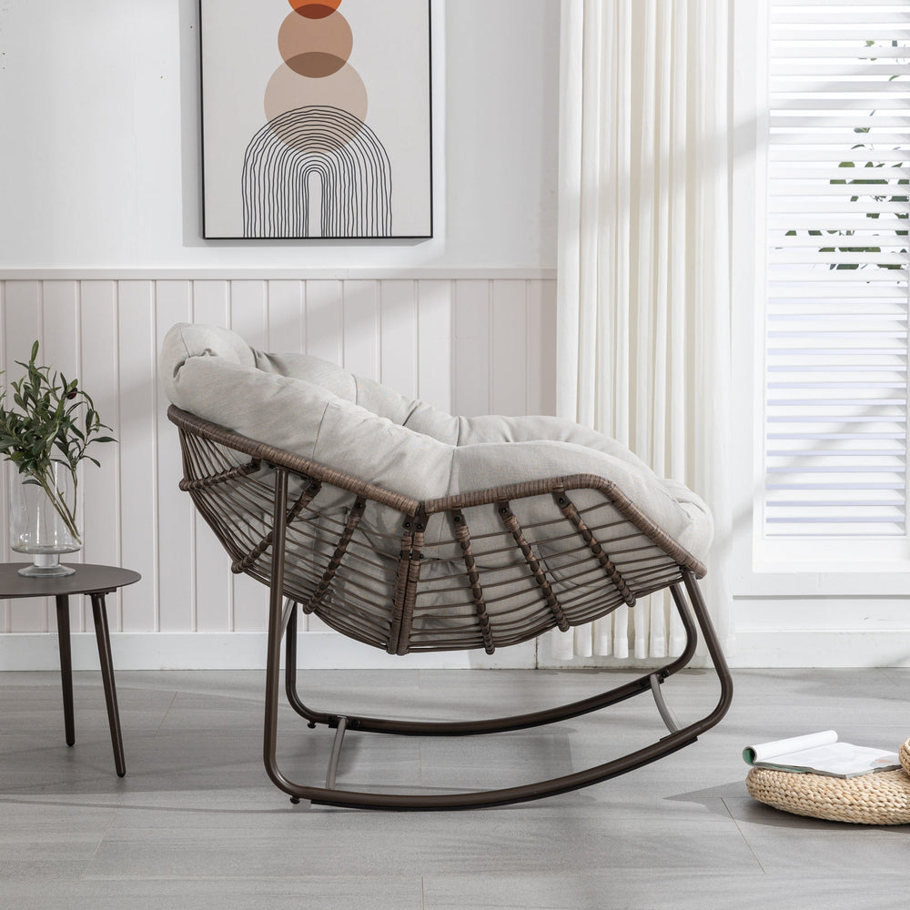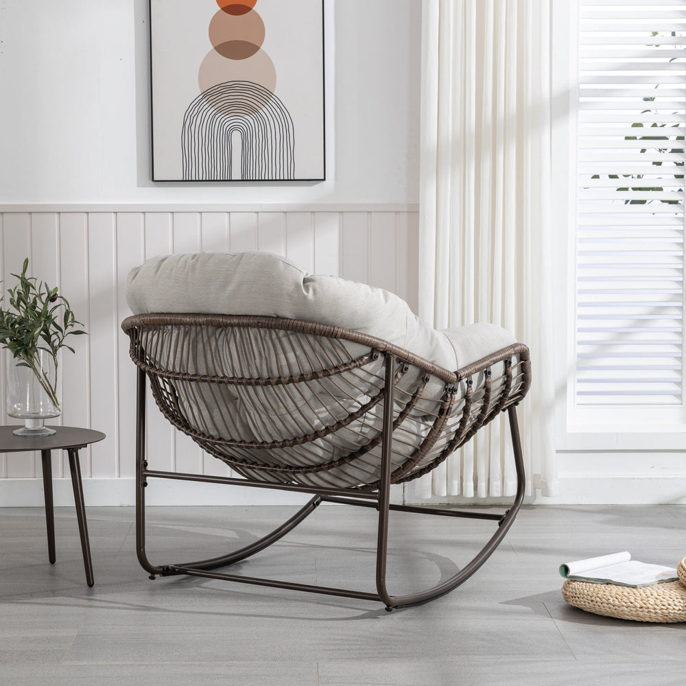 This outdoor rocking chair features a hand-woven synthetic rattan design with a padded cushion, perfect for enhancing comfort on your front porch, patio, garden, or living room. It combines functionality with an ergonomic and spacious design.
