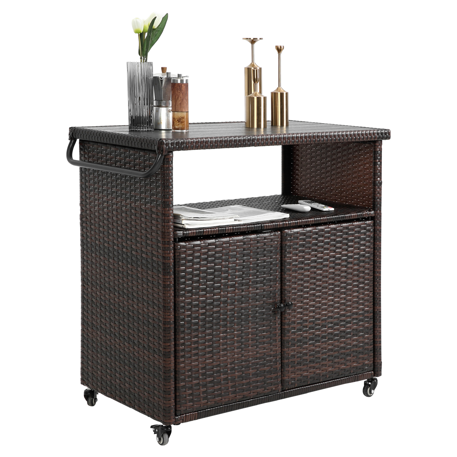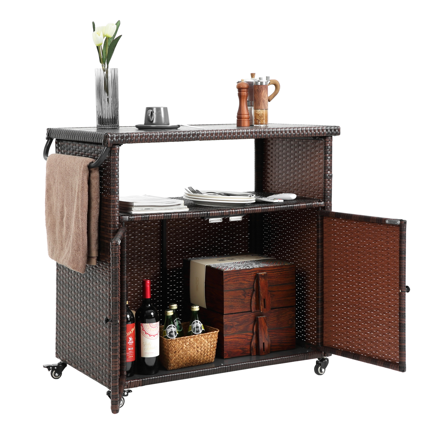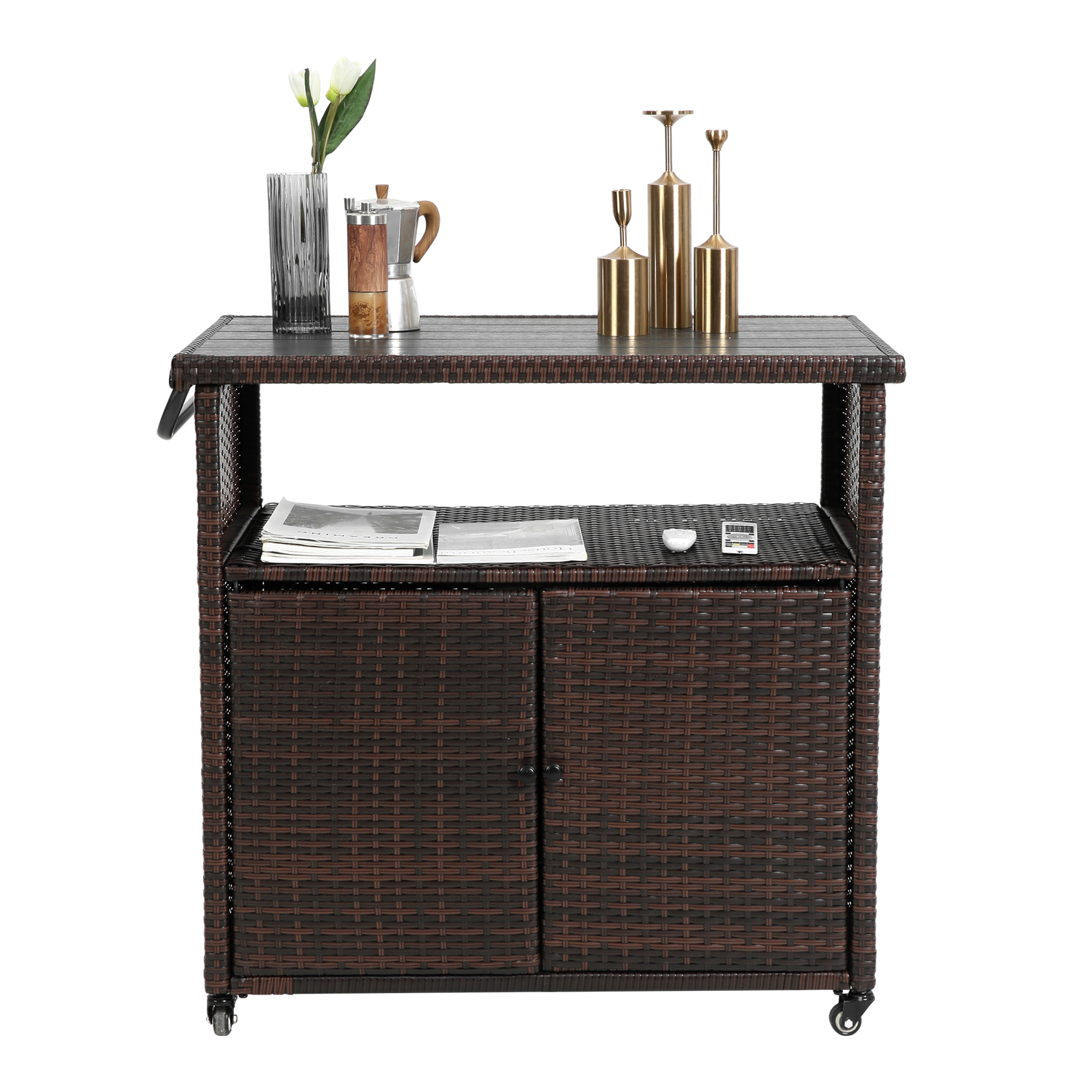 This outdoor wicker bar cart is designed for serving and entertaining in outdoor and indoor spaces such as patios, gardens, and poolside areas. It combines mobility with an elegant rattan design to complement any outdoor setting.