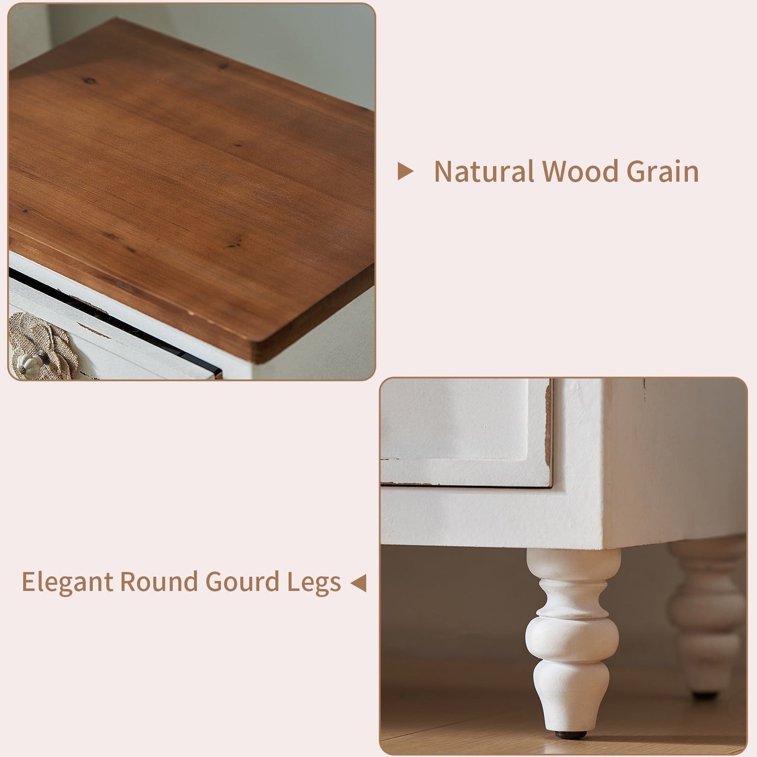 • Antique white painted cabinet body with walnut-toned natural wood top and drawer interiors