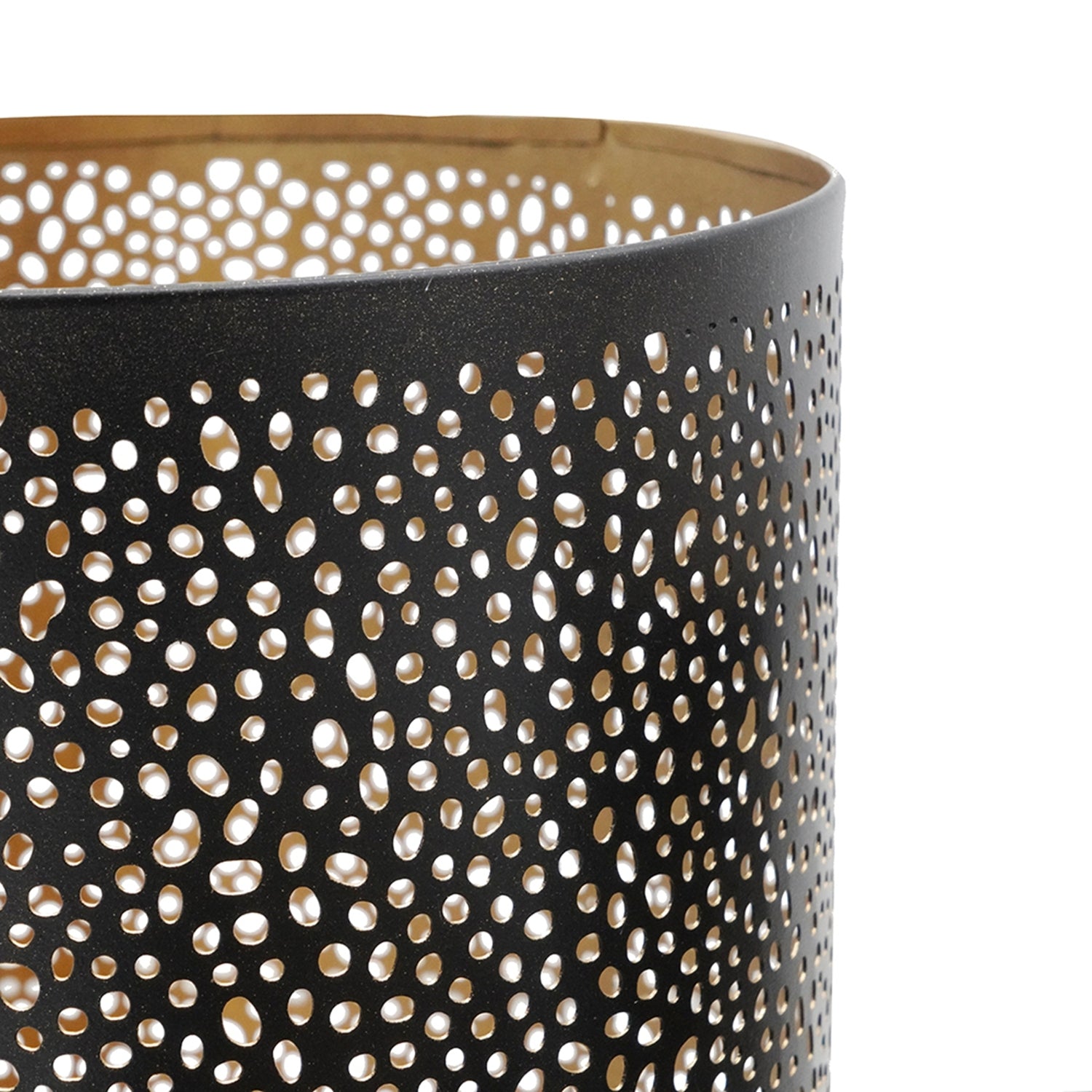 - Mesh-like pierced metal construction with matte bronze exterior and gold interior finishes