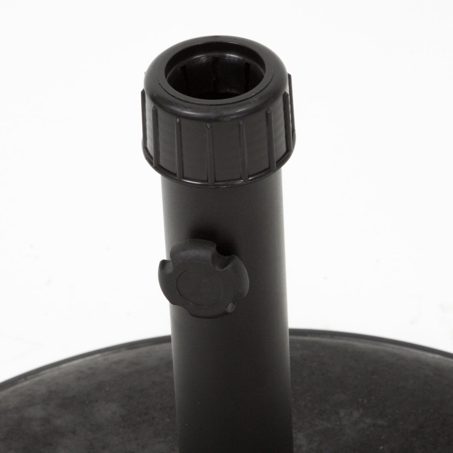 This concrete umbrella base with an iron support pole offers stability and style for outdoor spaces. It is ideal for patios or gardens, providing a secure foundation for umbrellas up to 5 feet.