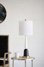 - Cylindrical white hardback shade with coordinating finial