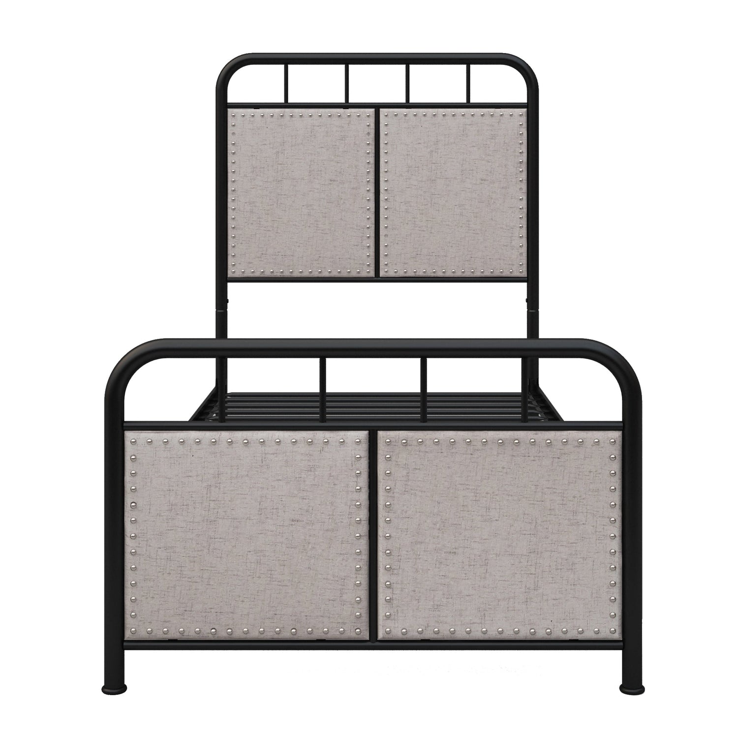 A twin size platform bed frame designed for bedrooms, featuring linen upholstered fabric on both the headboard and footboard for a contemporary look combined with functional durability.