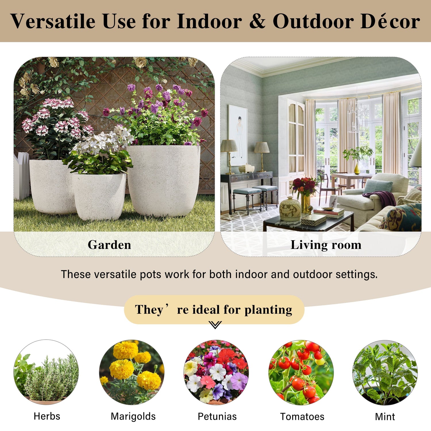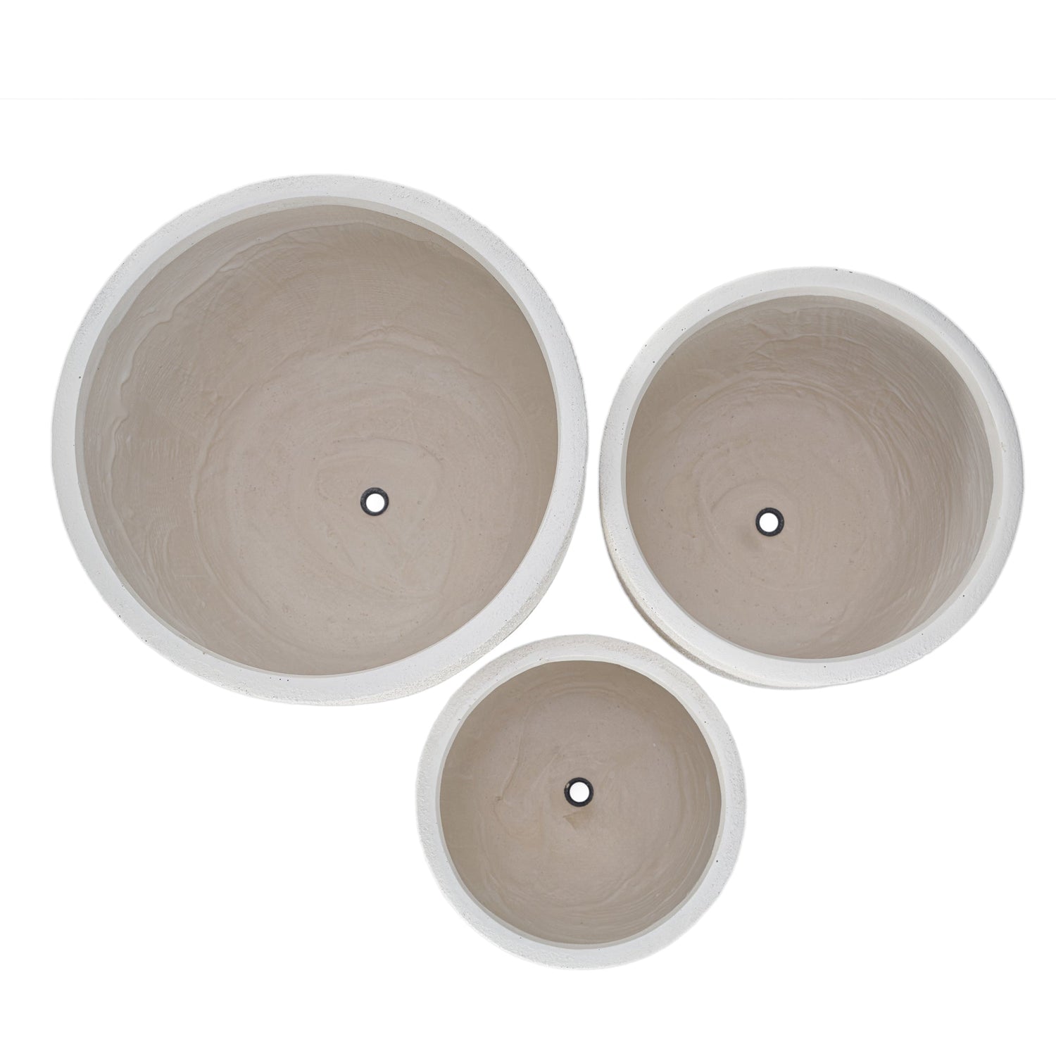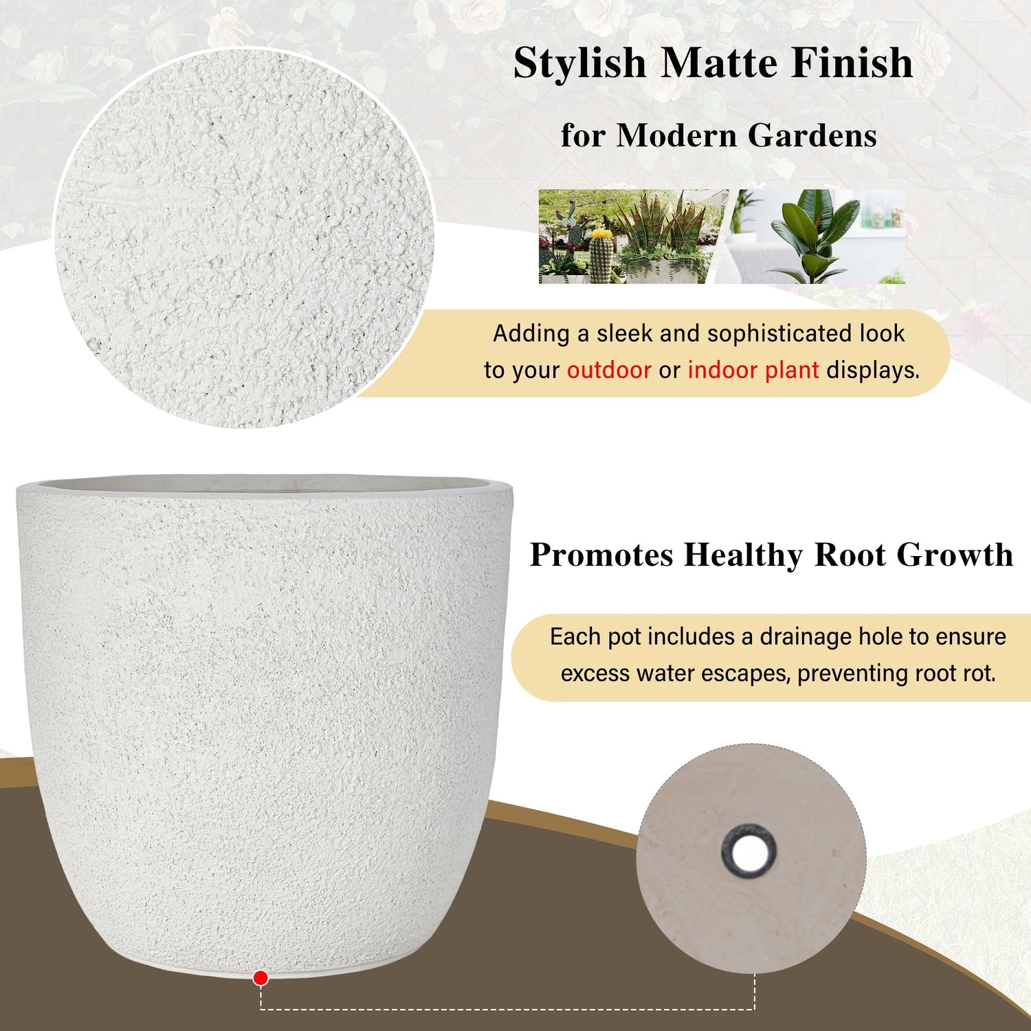 This set of three lightweight flower pots features a matte textured finish and is made from durable magnesium oxide. Designed for both indoor and outdoor use, they complement gardens, patios, balconies, and other spaces with both functionality and style.
