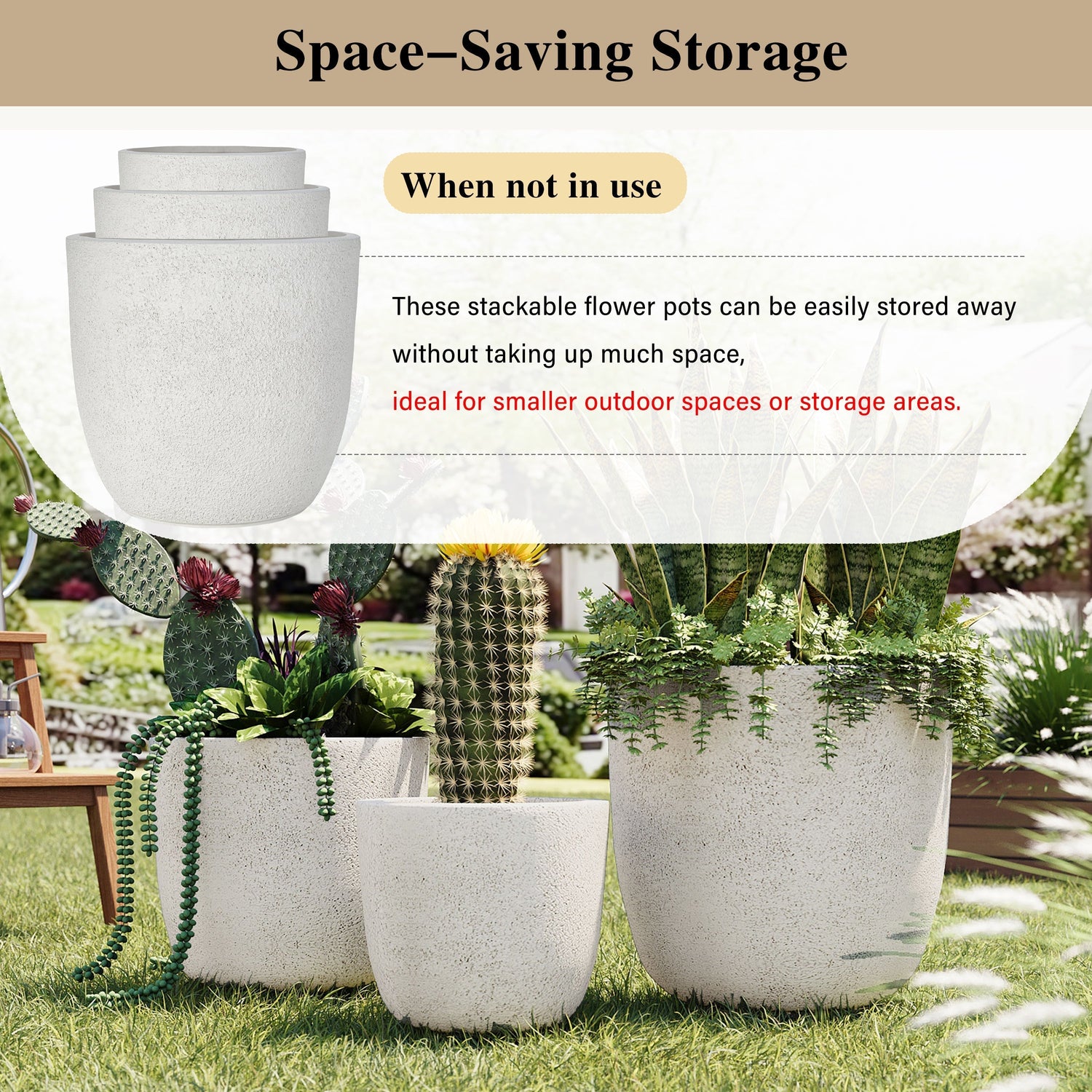 - Includes three graduated pots (large, medium, and small) for versatile planting displays.