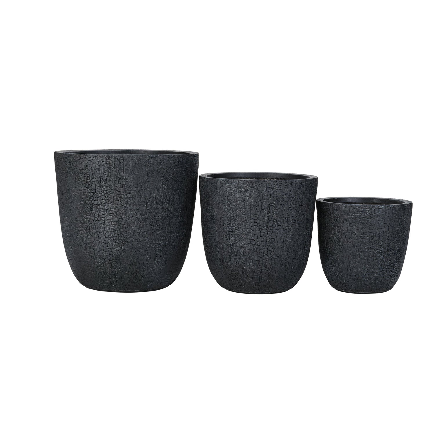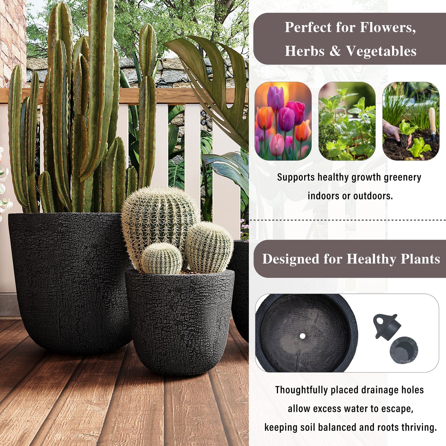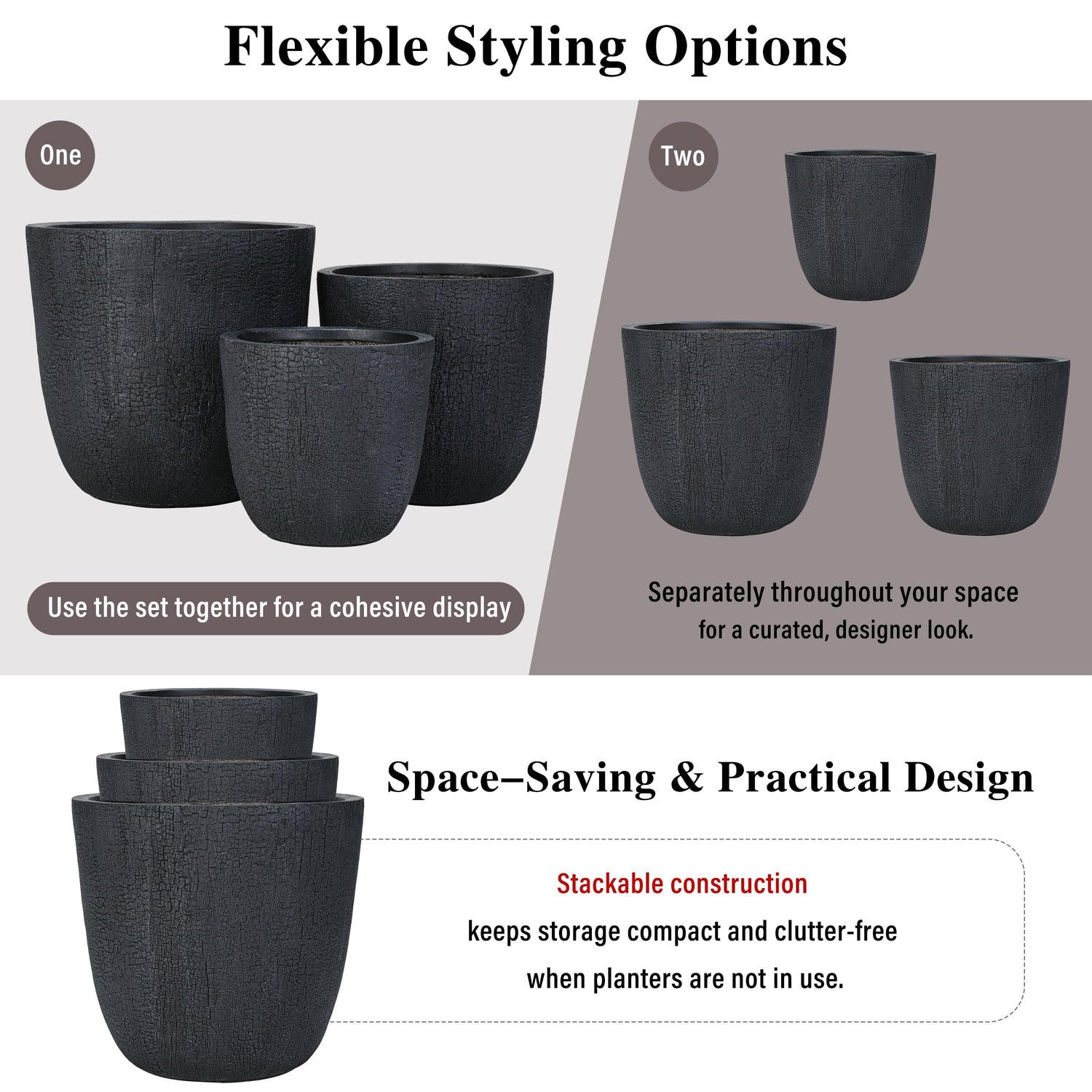 This set of three lightweight magnesium oxide planters is designed for versatile use in patios, gardens, balconies, porches, and indoor spaces, offering a natural stone-like finish with practical features.