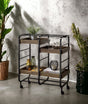 The Vorrik Serving Cart is a versatile bar cart suited for living rooms or dining areas, combining functional storage with stylish black and walnut finishes.