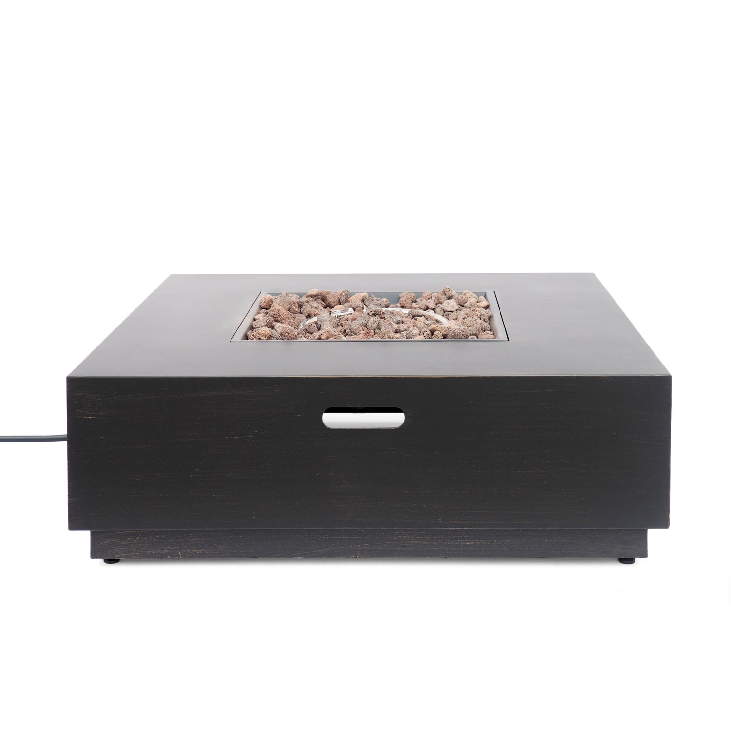 The Wellington Fire Pit is a 40-inch square outdoor fire pit crafted from durable iron in brown and gold tones. Perfect for adding warmth and style to patios, gardens, or backyard seating areas.