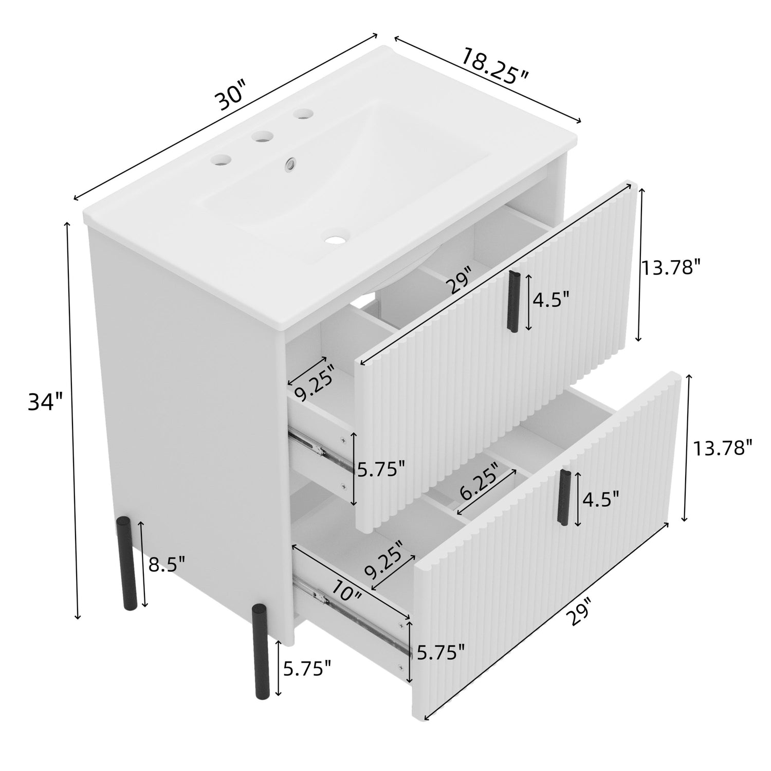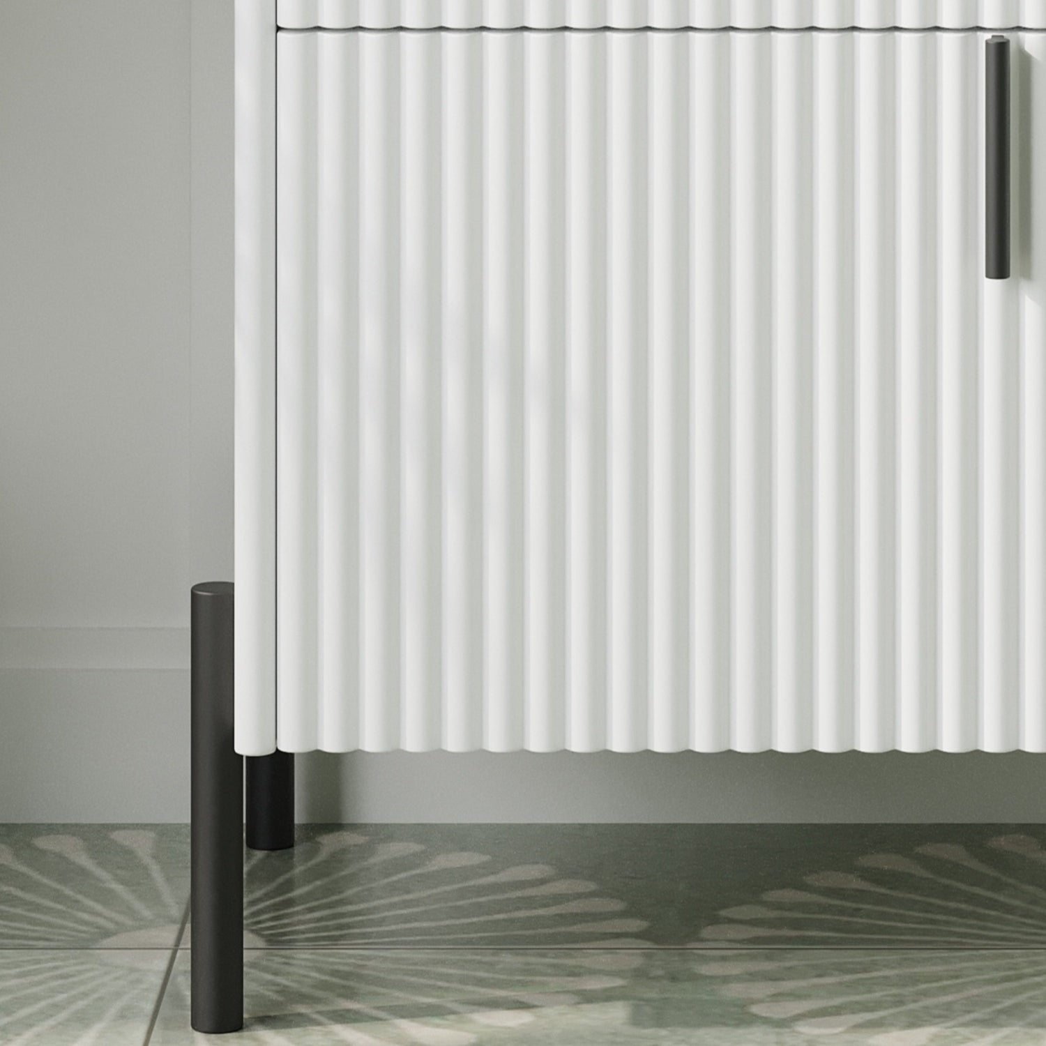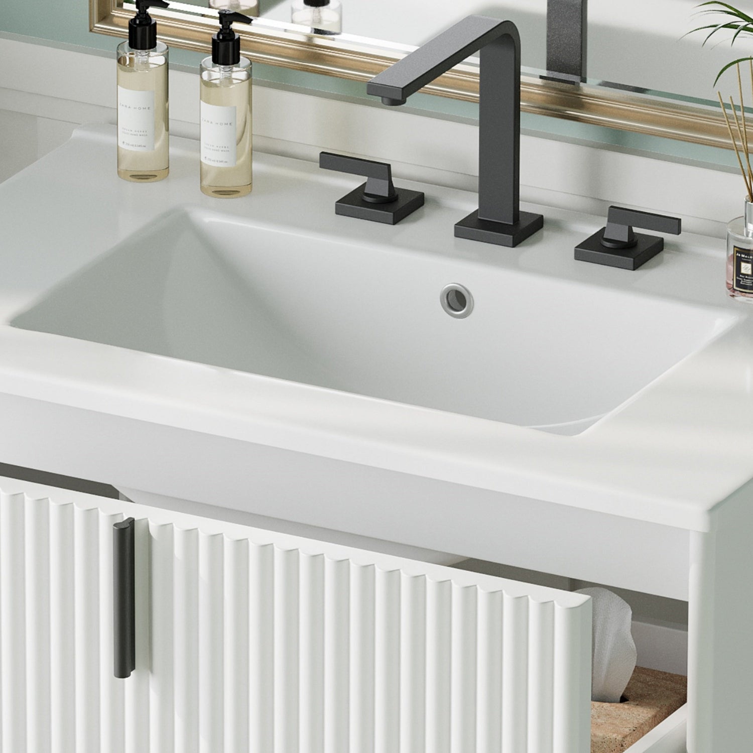 This white fluted bathroom vanity features a ceramic sink and soft-close drawers, designed to enhance both style and storage functionality in your bathroom space.