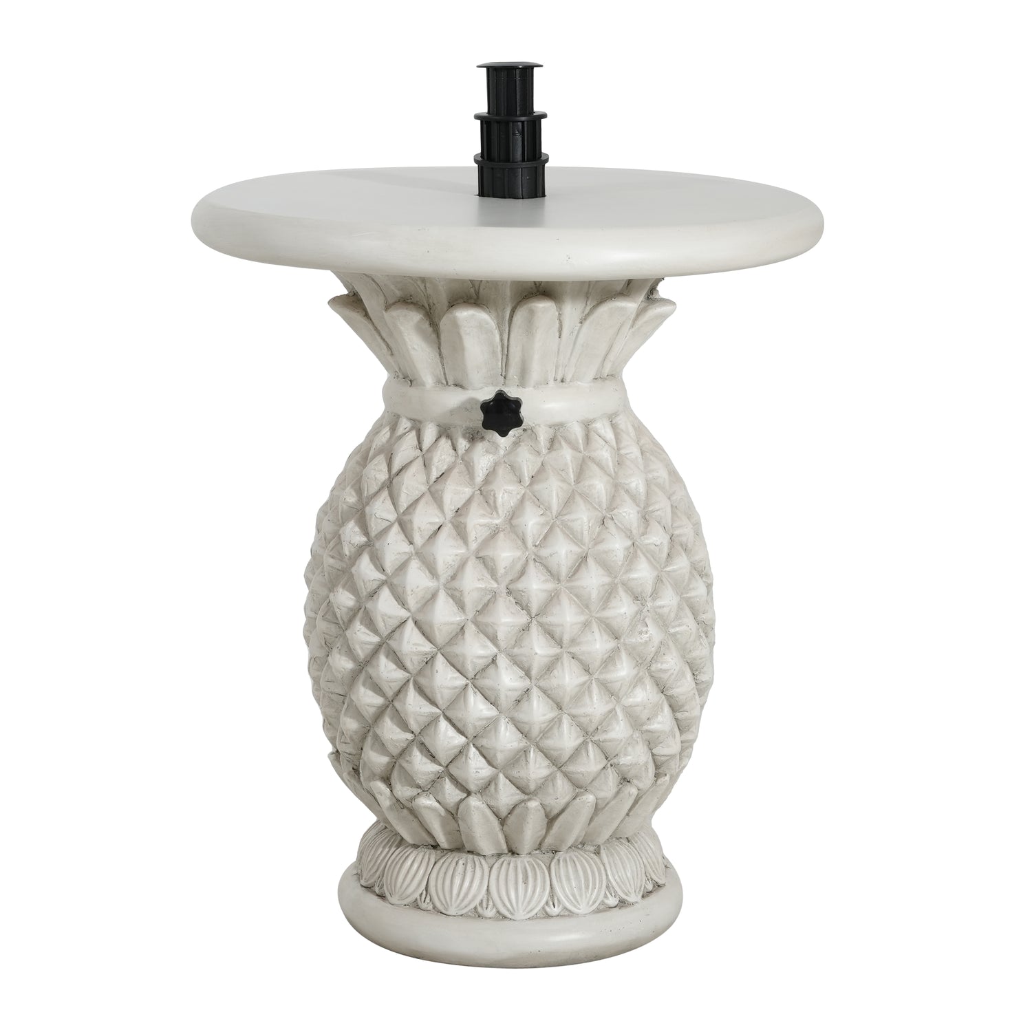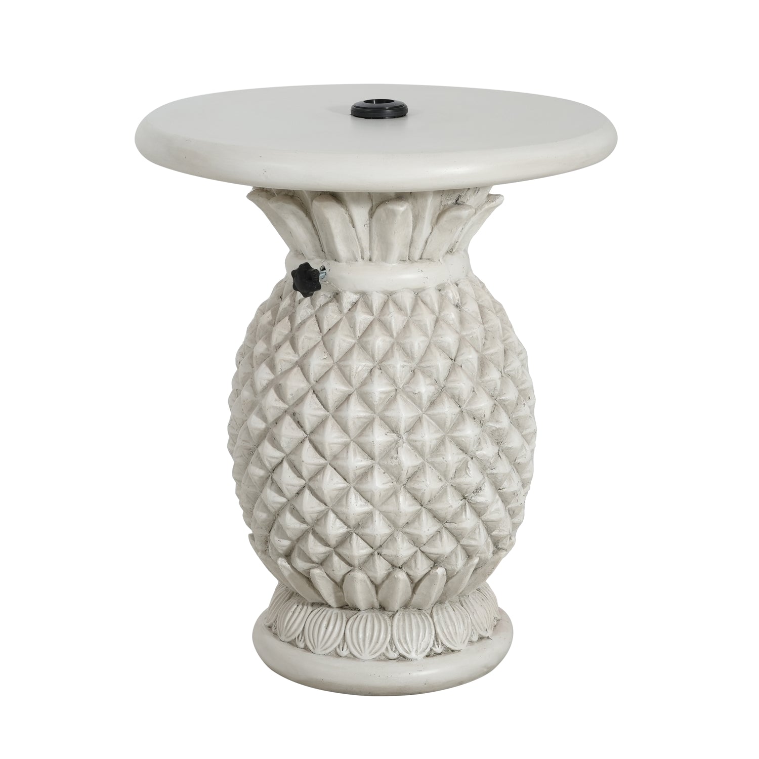 - Transform your outdoor oasis with this whimsical pineapple-shaped umbrella base, crafted from durable magnesium oxide in a timeless Antique White finish. Its playful yet elegant design doubles as a charming side table, blending tropical flair with practical functionality for patios, gardens, or poolside settings.