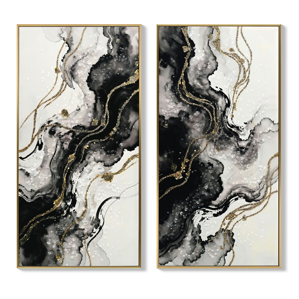 This set of two large framed canvas prints features bold, minimalist abstract designs in black, white, and gold. Ideal for living rooms, offices, or any contemporary space, these artworks add a sophisticated focal point with a premium hand-crafted finish.