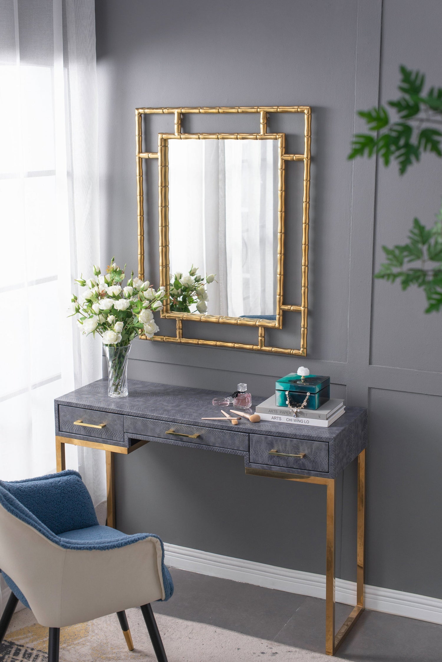 - Constructed from MDF, glass, stone, and iron for durability