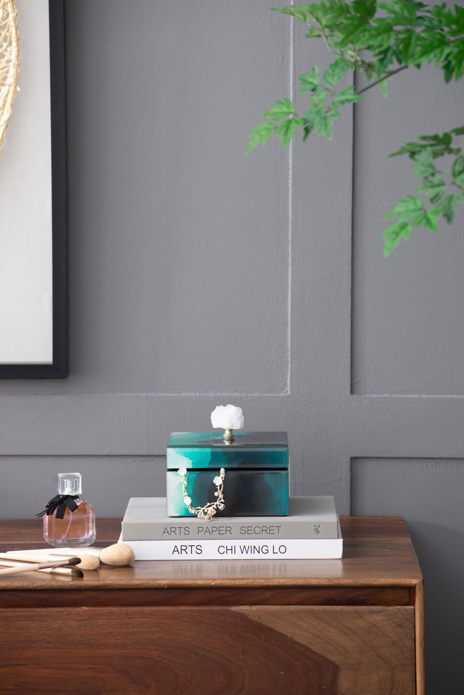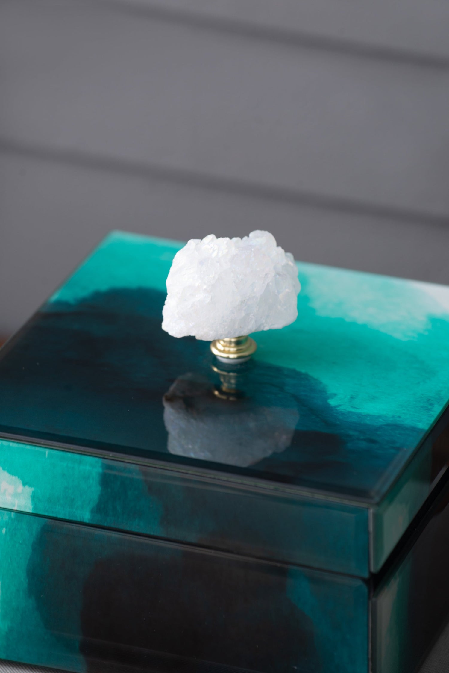 - Features a dynamic dark-to-light pattern with a glittering geode finial and gold accents