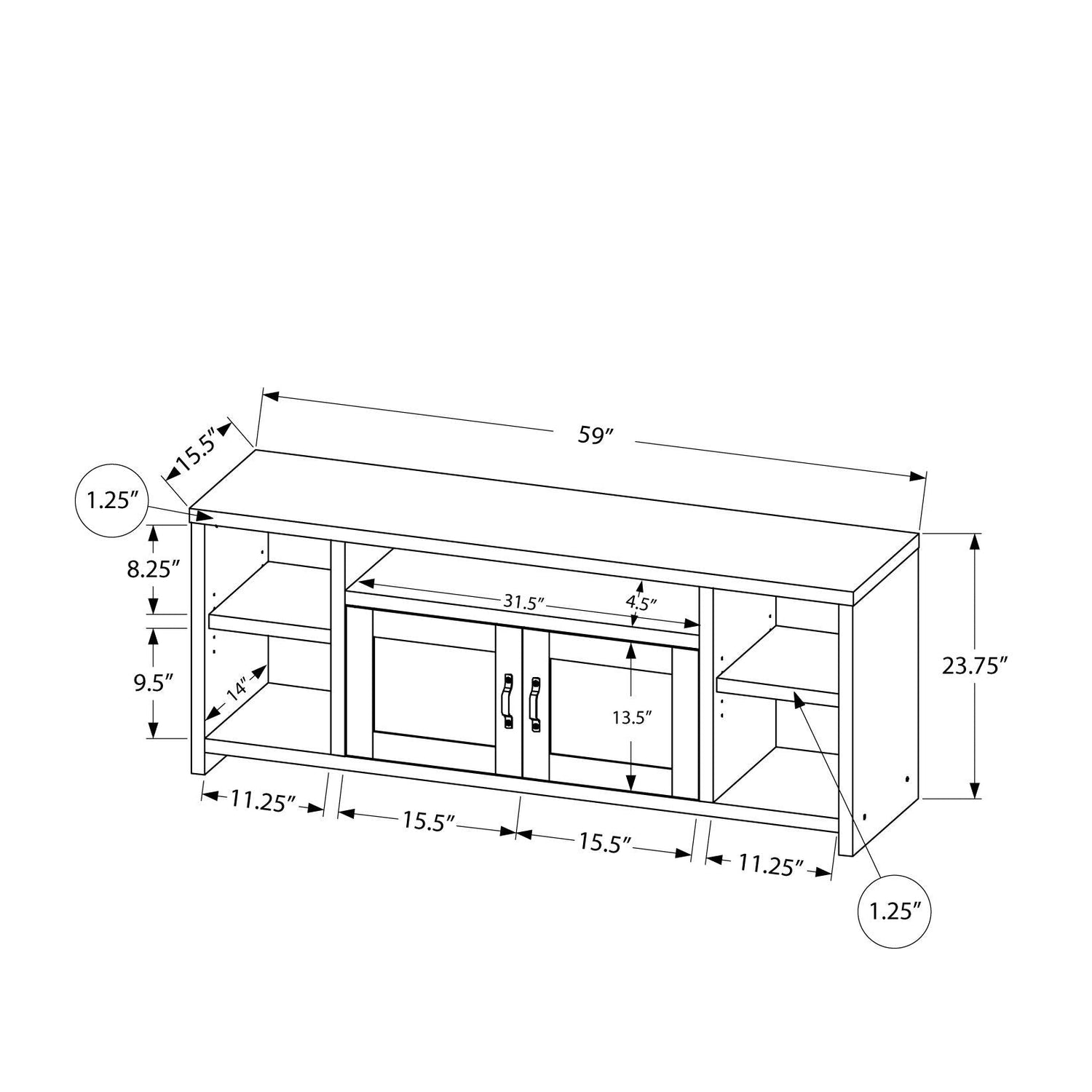 59 inches (W) x 15.5 inches (D) x 23.75 inches (H)